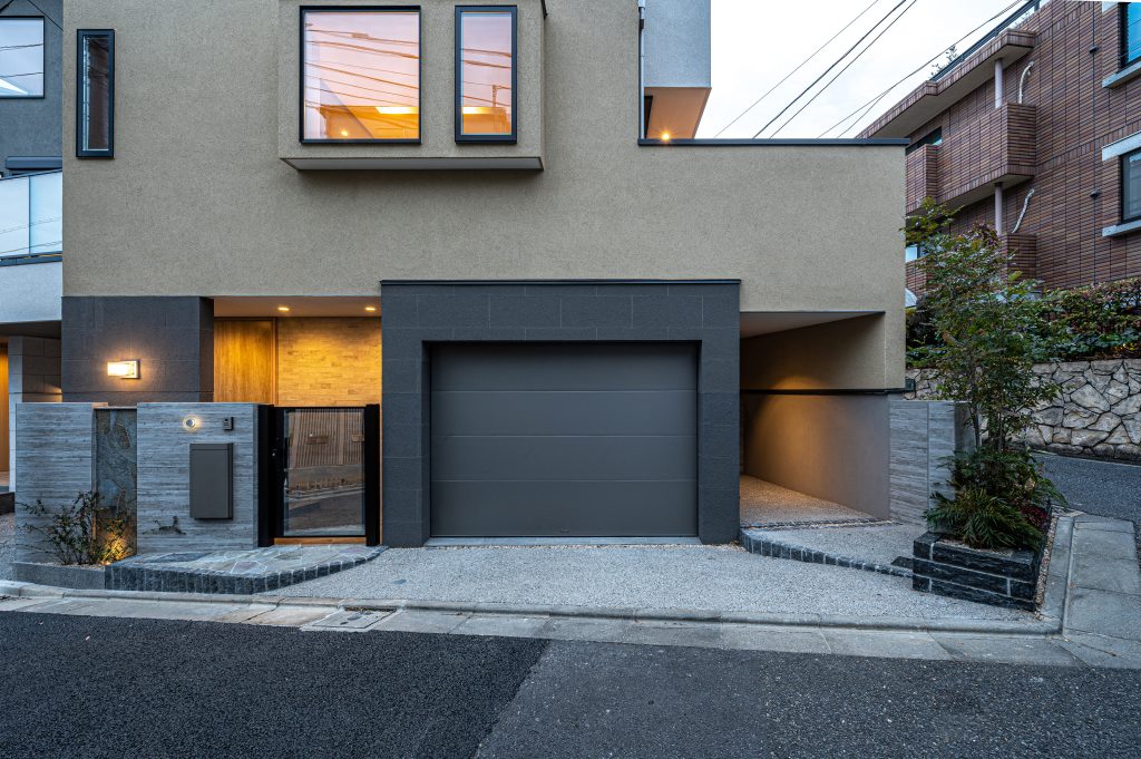 外構は杉板RC意匠タイルや乱形石その他様々なマテリアルと組み合わせながら、和の趣が漂うひとつの美しい景観を創造しました。