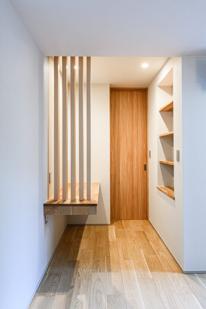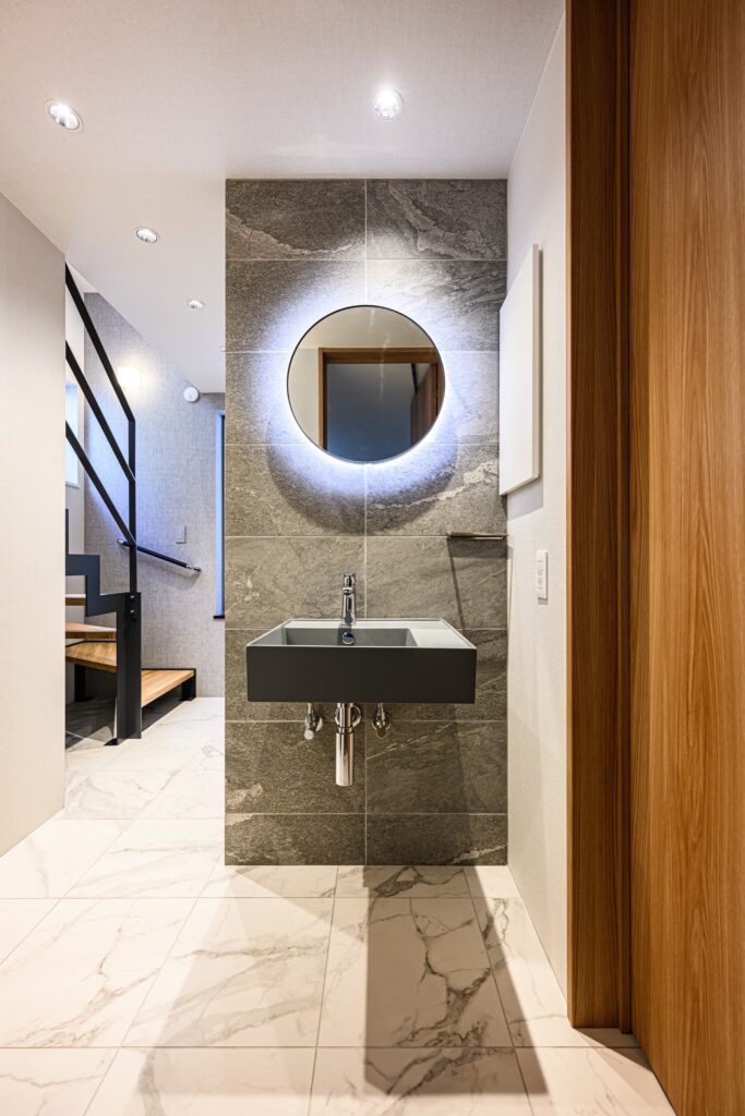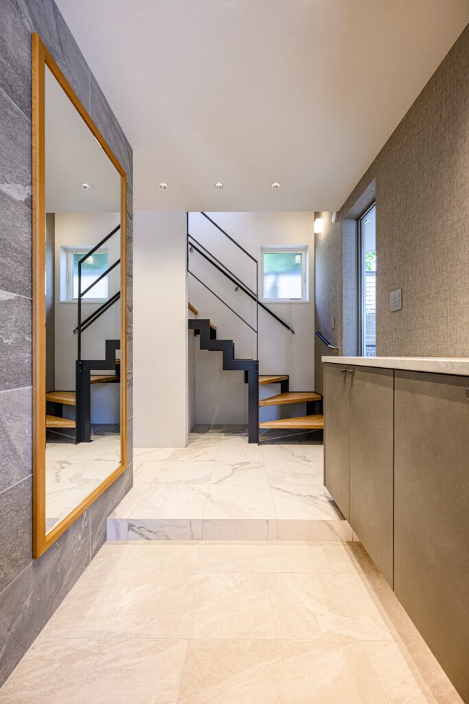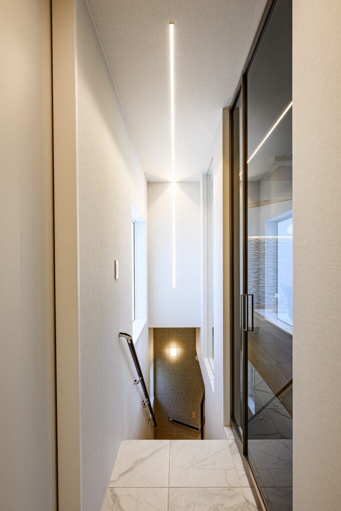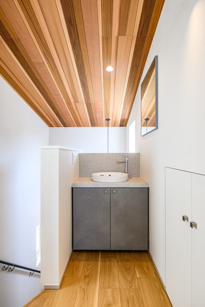 敷地の形状を活かし、無駄を削ぎ落とした美しいプランニングが息づく一邸。温もりある木目と、清潔感あふれる白を基調に、随所に深みのあるタイルを施し、洗練と落ち着きを併せ持つモダンな空間を演出しました。