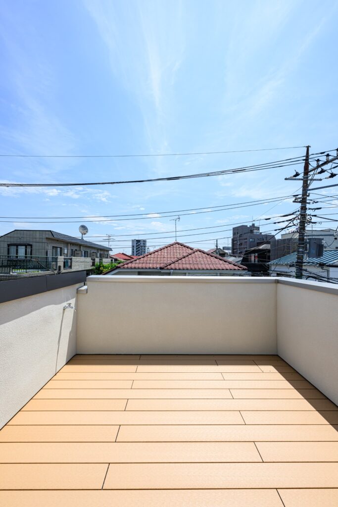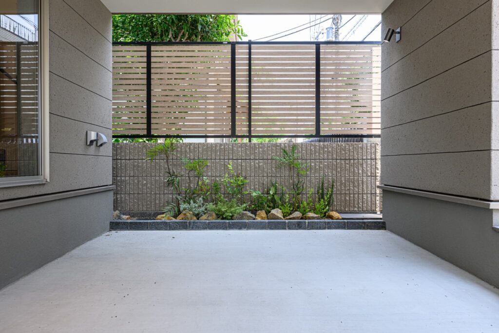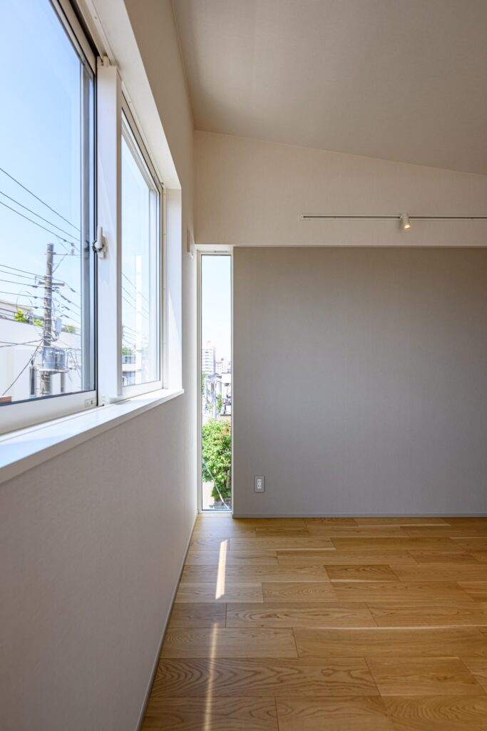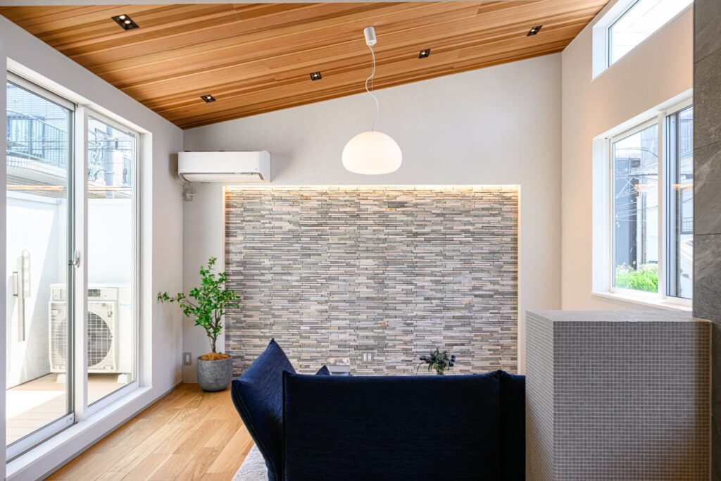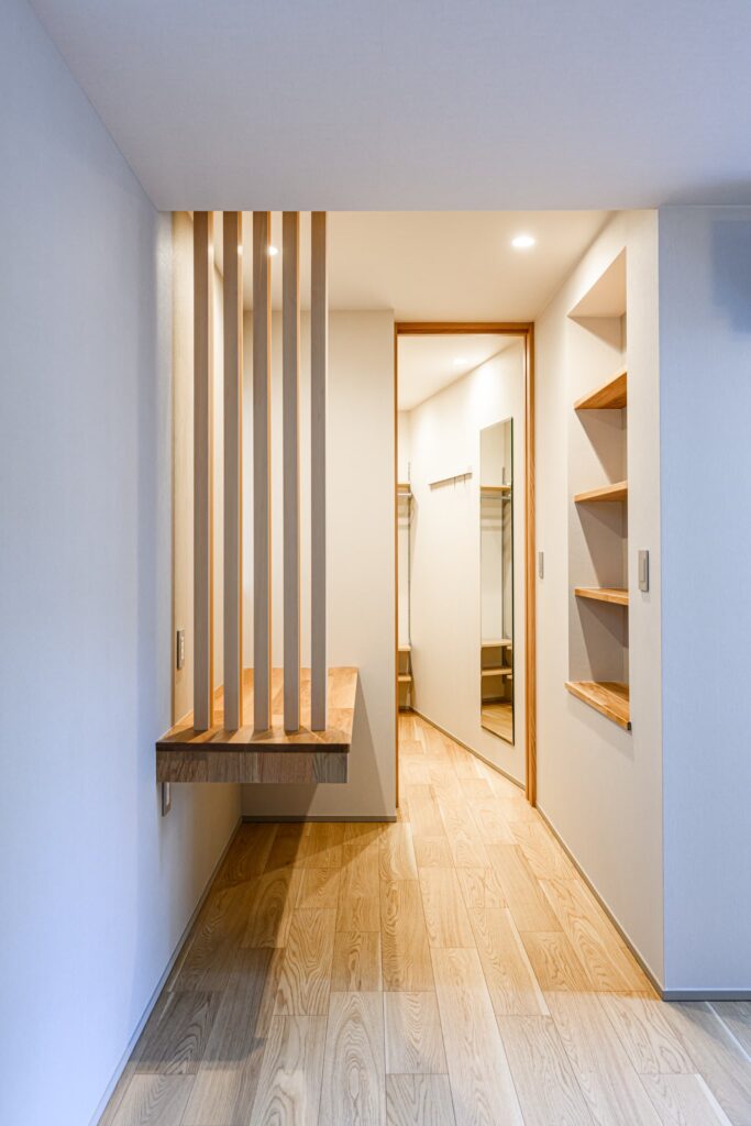 敷地の形状を活かし、無駄を削ぎ落とした美しいプランニングが息づく一邸。温もりある木目と、清潔感あふれる白を基調に、随所に深みのあるタイルを施し、洗練と落ち着きを併せ持つモダンな空間を演出しました。