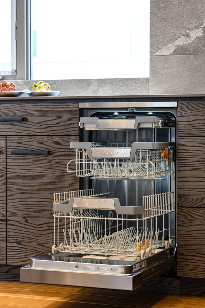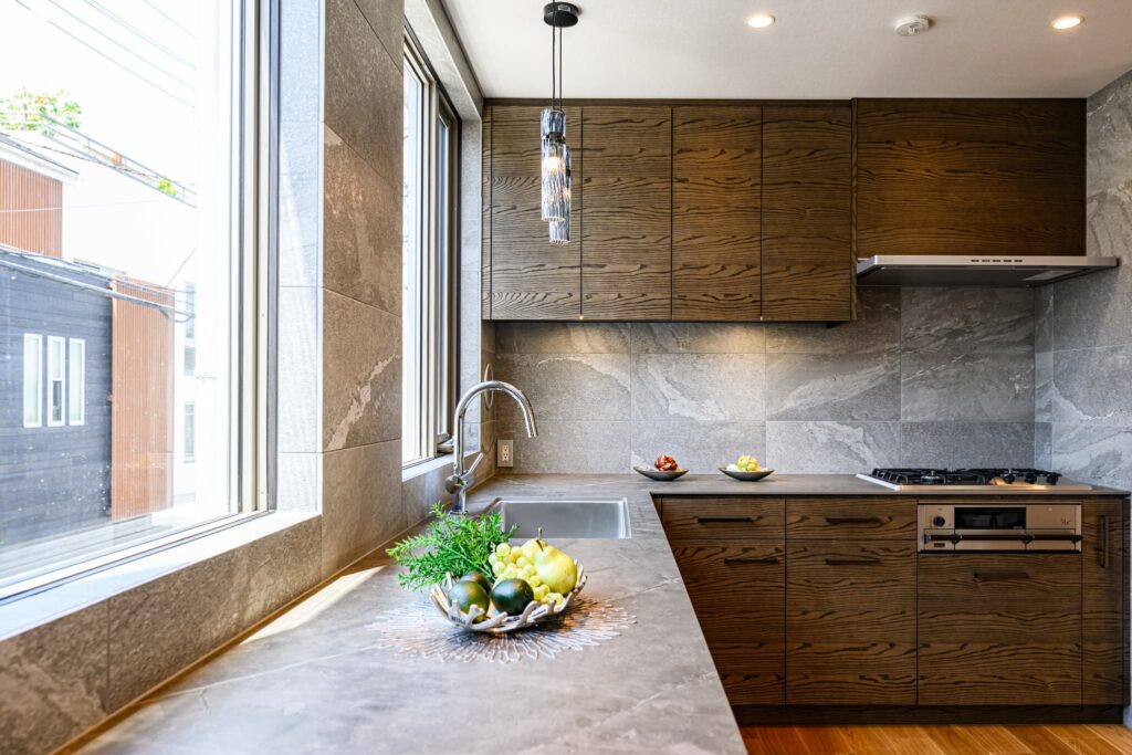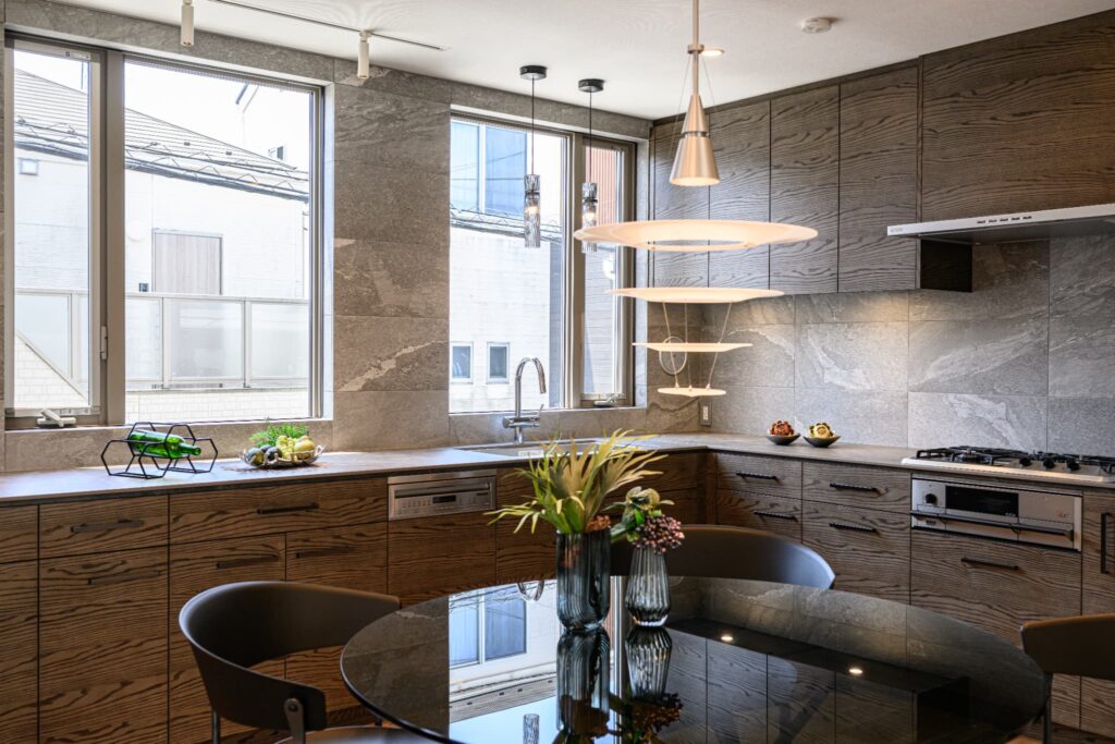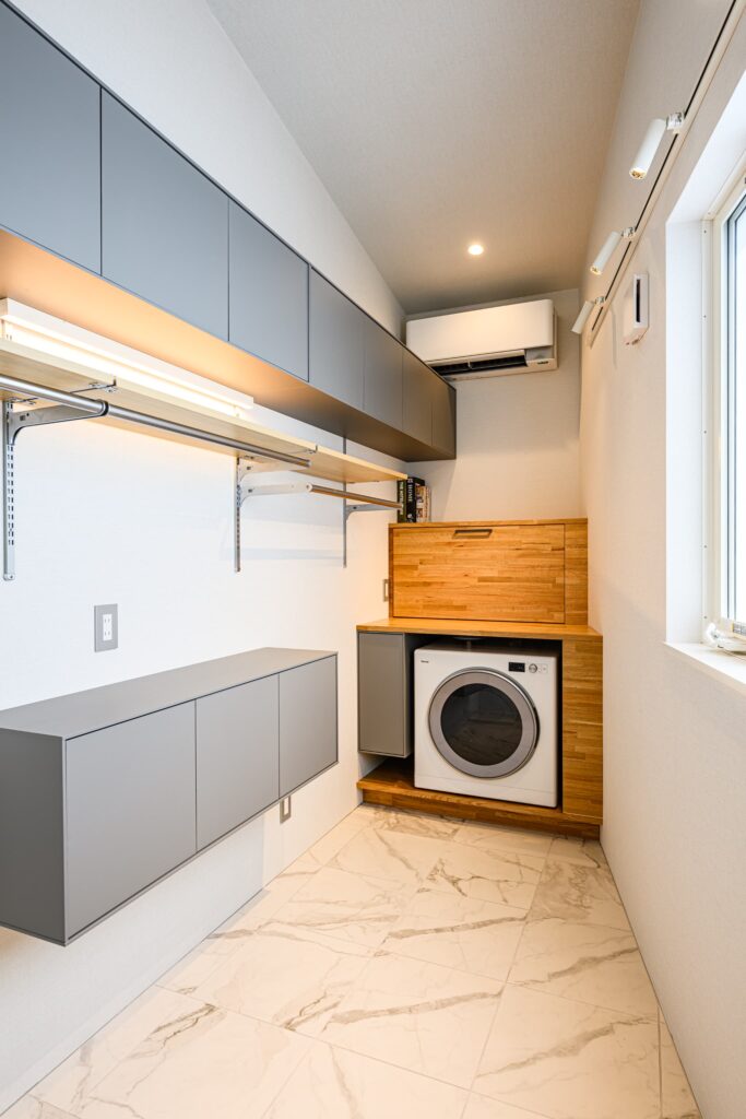 LDKは、空間全体が一体となるよう設計され、キッチンまで視線が心地よく抜ける構成。そのキッチンには、上質な素材とクラフトマンシップが息づくCUCINA(クチーナ)を採用。突板面材の美しい表情が、住まいに静かな存在感をもたらします。ミーレの食洗機や、ハーマン製のダッチオーブン付きガスコンロなど、機能美にもこだわり、日々の暮らしを豊かに彩ります。またランドリールームには、ガス乾燥機「乾太くん」を設置。造作棚とともに、設計段階から考え抜かれた機能的な空間は、家事動線を美しく整え、住まい全体に心地よいリズムを生み出しています。静けさと上質を纏い、暮らすほどに心が満たされる住まいです。