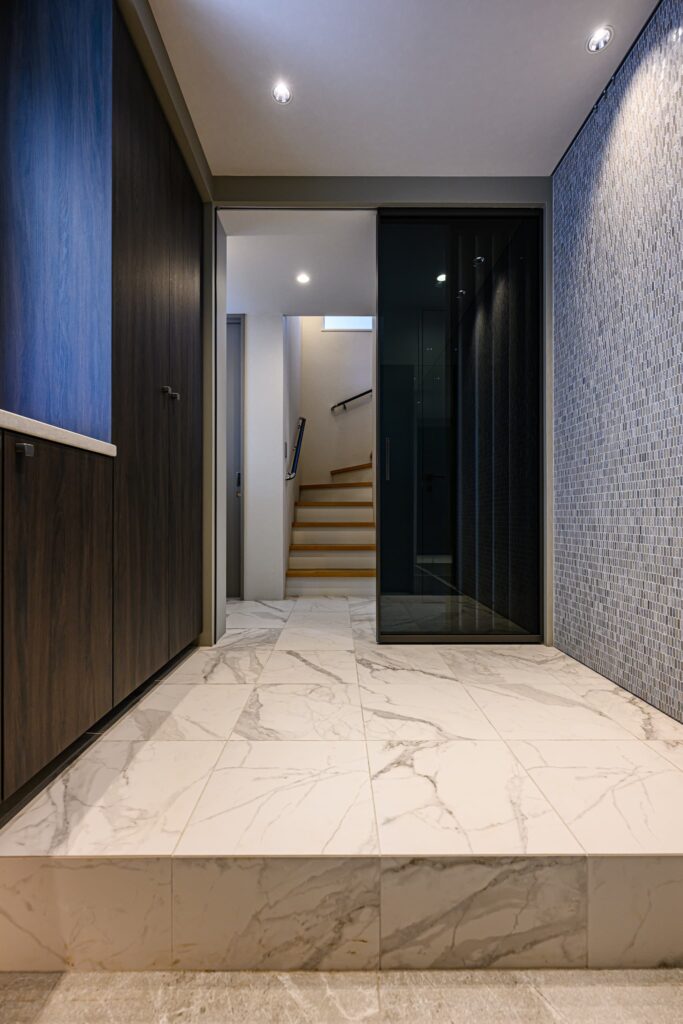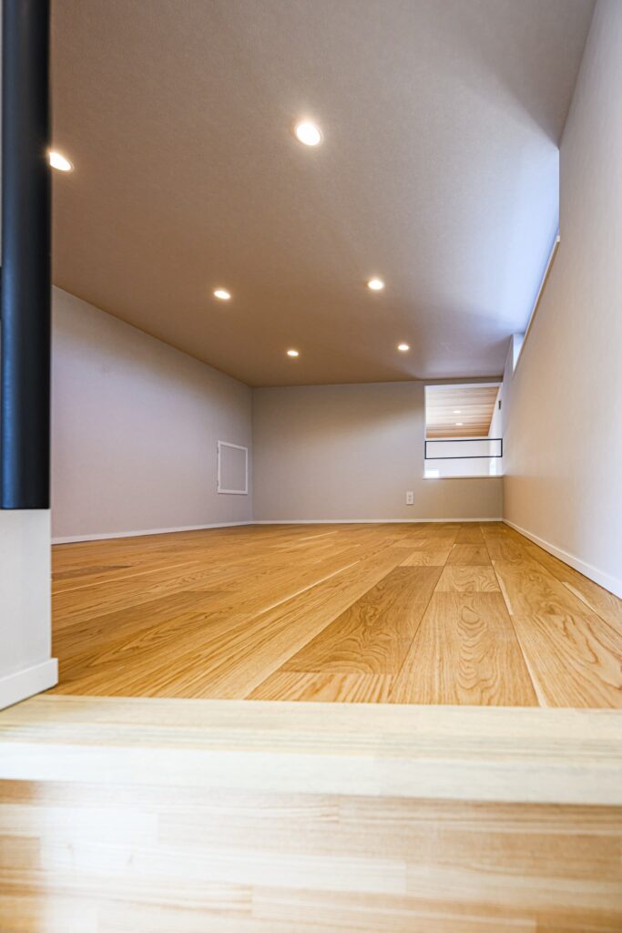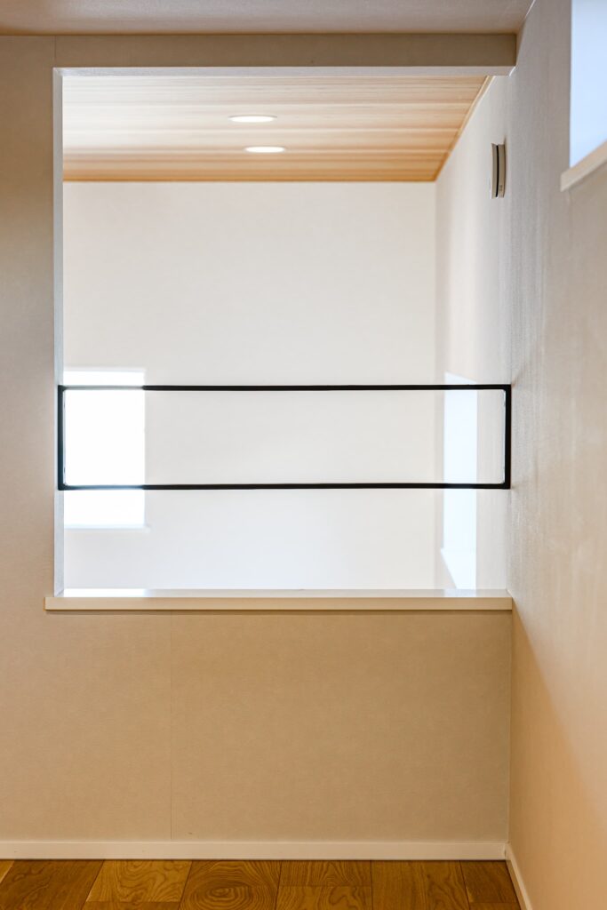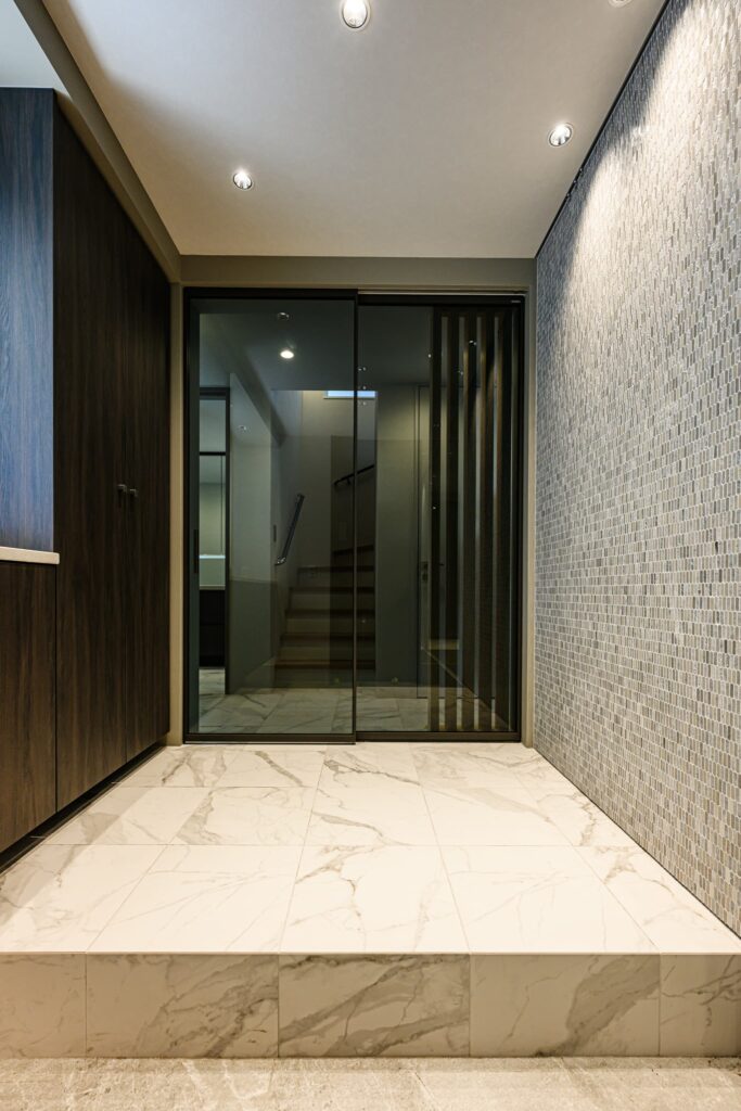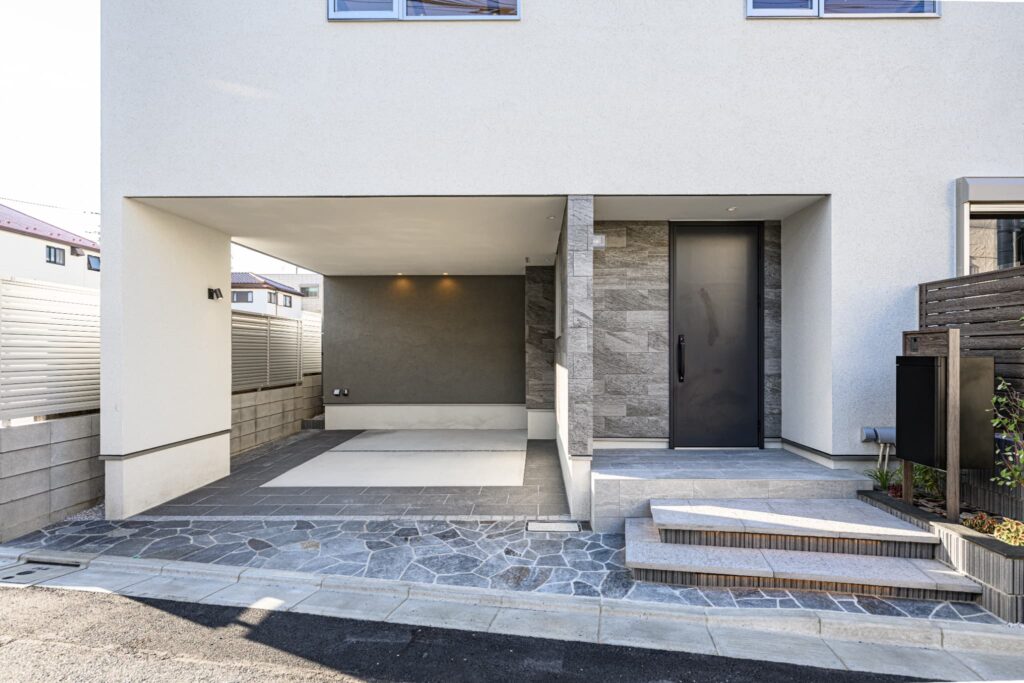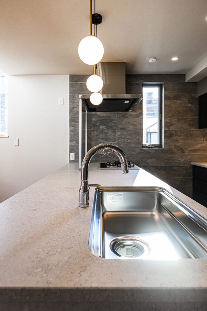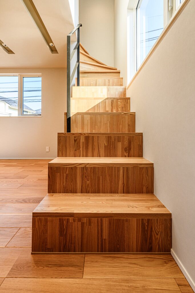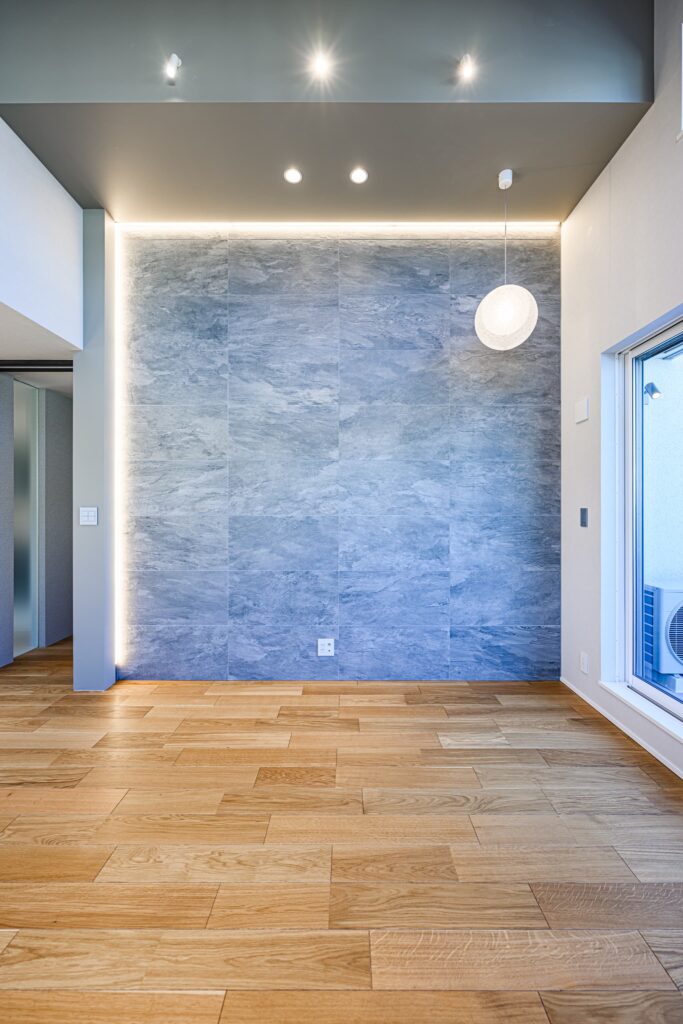 1階の主寝室は角に配置され、道路からの引きを生かしたテラスを併設しています。植栽の緑を眺めながら穏やかな時間を過ごせるように計画し、フェンスや塀には透過性を持たせることで、プライバシーを守りながらも開放感を感じられるよう工夫しました。上階へ進むと、この住まいの一番の見せ場となるLDKが広がります。三方向からたっぷりの光が差し込み、明るく心地よい空間に。リビングと一体で使える約6.5帖のバルコニーは、食事やくつろぎの時間を外へと広げ、暮らしの楽しみを豊かにします。天井高約4mのリビングには大判タイルをあしらった壁を設け、そこに浮かぶペンダント照明が日常をやわらかく彩ります。さらに小屋裏へ続く造作階段は、下部をオープン棚としたことで収納とディスプレイを兼ねた存在に。雑貨や趣味の小物を飾ることで暮らしの個性を映し出します。全体のコーディネートは明るいグレイッシュカラーを基調としたアーバンスタイルで、玄関には六角形の天然石モザイクタイルを採用し、訪れる人をやさしく迎える印象的なアクセントとしました。