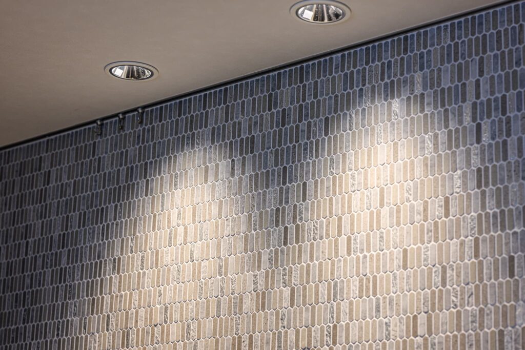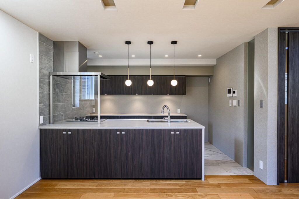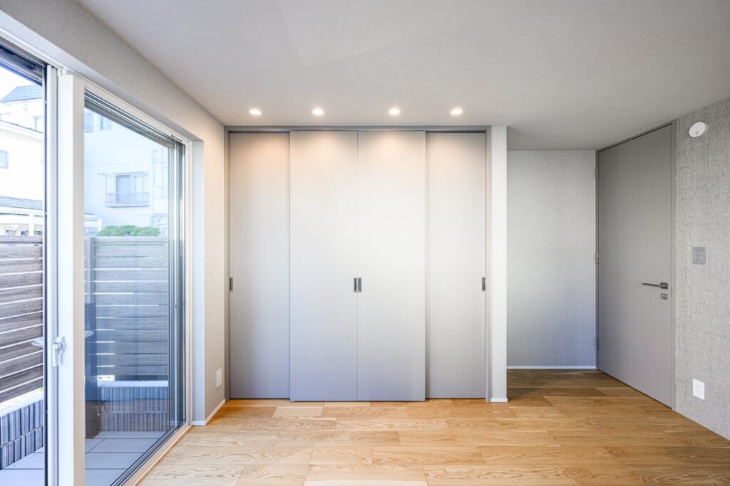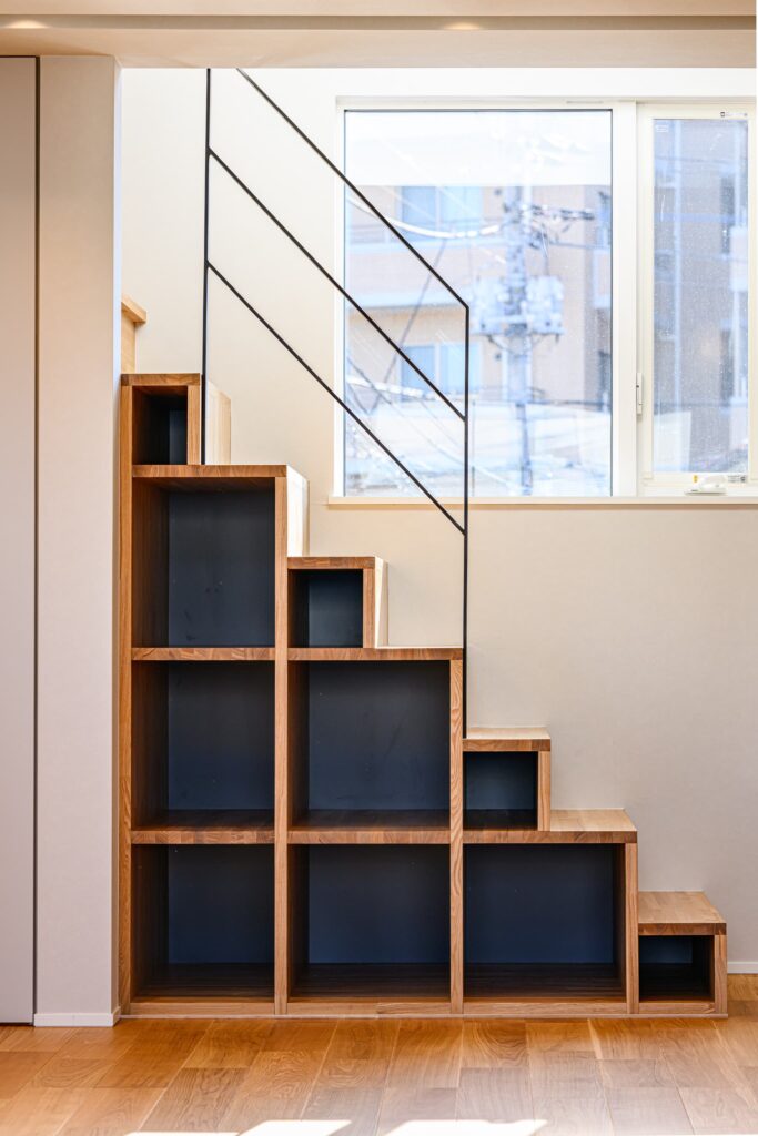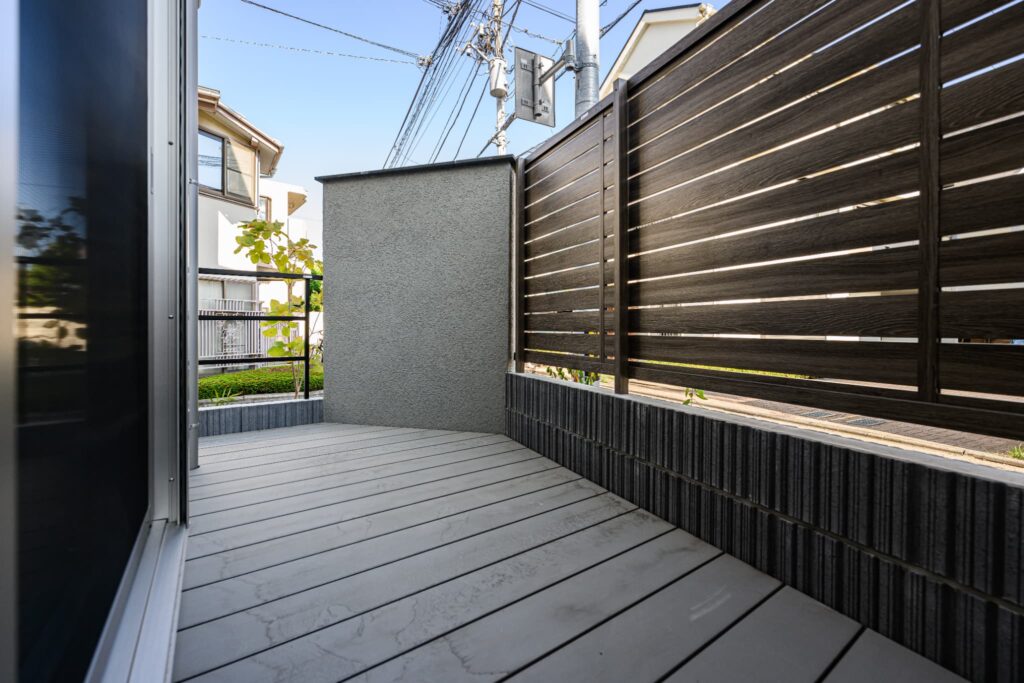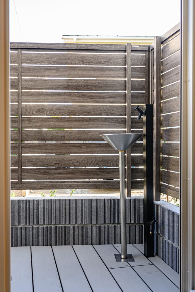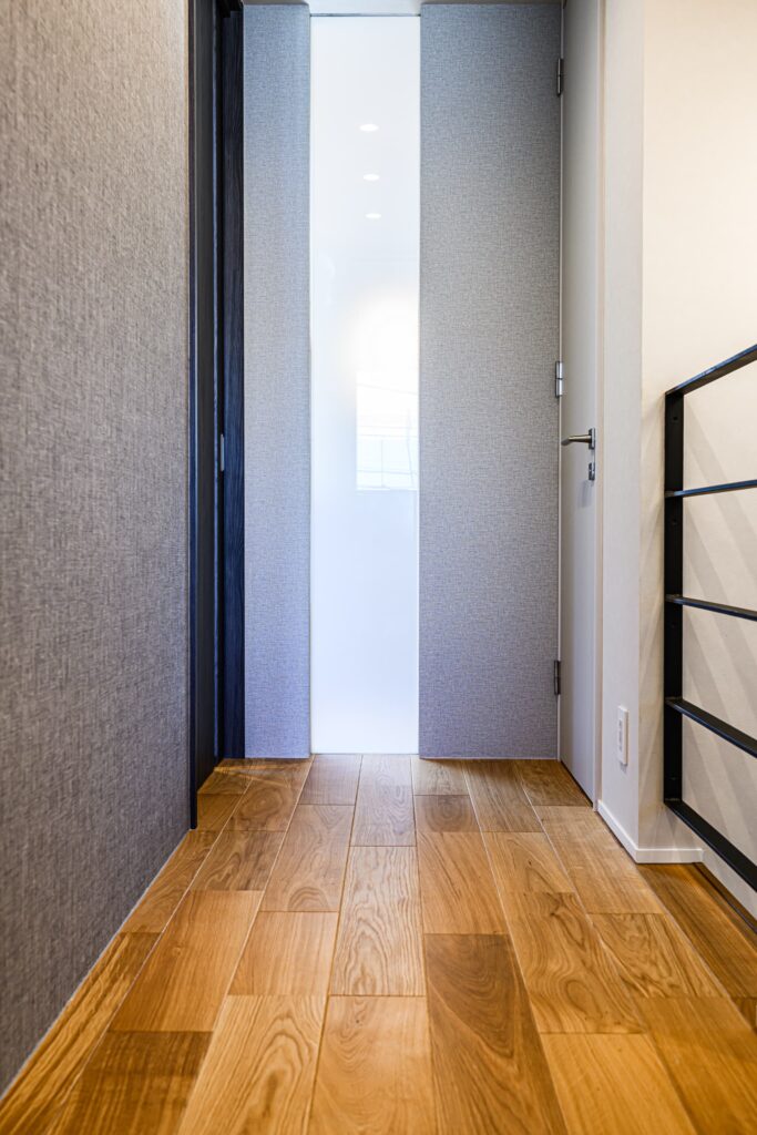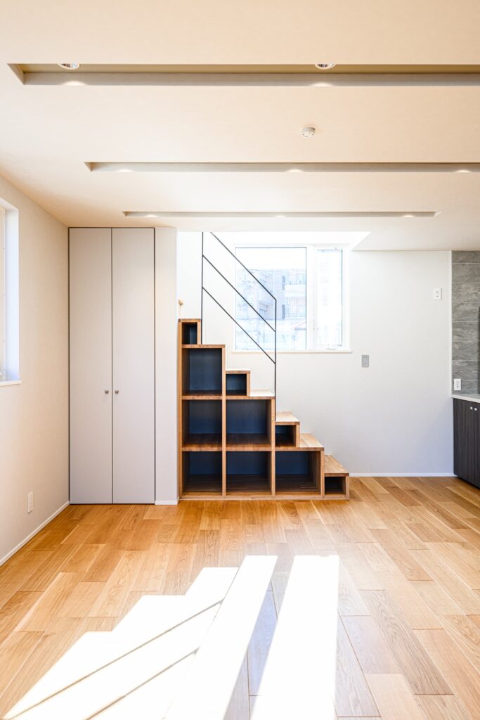 1階の主寝室は角に配置され、道路からの引きを生かしたテラスを併設しています。植栽の緑を眺めながら穏やかな時間を過ごせるように計画し、フェンスや塀には透過性を持たせることで、プライバシーを守りながらも開放感を感じられるよう工夫しました。上階へ進むと、この住まいの一番の見せ場となるLDKが広がります。三方向からたっぷりの光が差し込み、明るく心地よい空間に。リビングと一体で使える約6.5帖のバルコニーは、食事やくつろぎの時間を外へと広げ、暮らしの楽しみを豊かにします。天井高約4mのリビングには大判タイルをあしらった壁を設け、そこに浮かぶペンダント照明が日常をやわらかく彩ります。さらに小屋裏へ続く造作階段は、下部をオープン棚としたことで収納とディスプレイを兼ねた存在に。雑貨や趣味の小物を飾ることで暮らしの個性を映し出します。全体のコーディネートは明るいグレイッシュカラーを基調としたアーバンスタイルで、玄関には六角形の天然石モザイクタイルを採用し、訪れる人をやさしく迎える印象的なアクセントとしました。