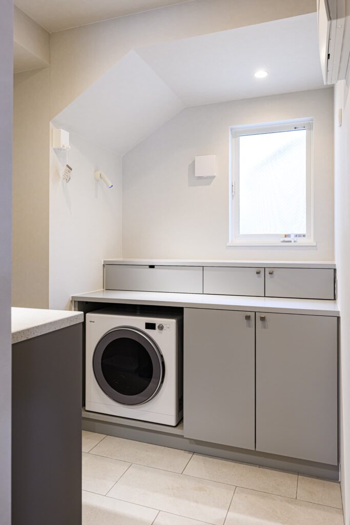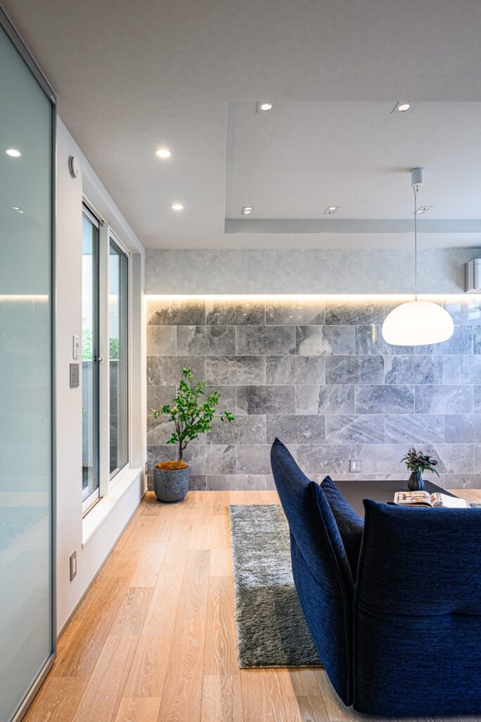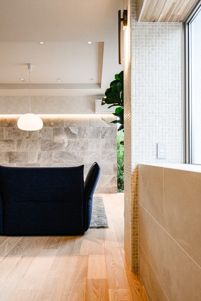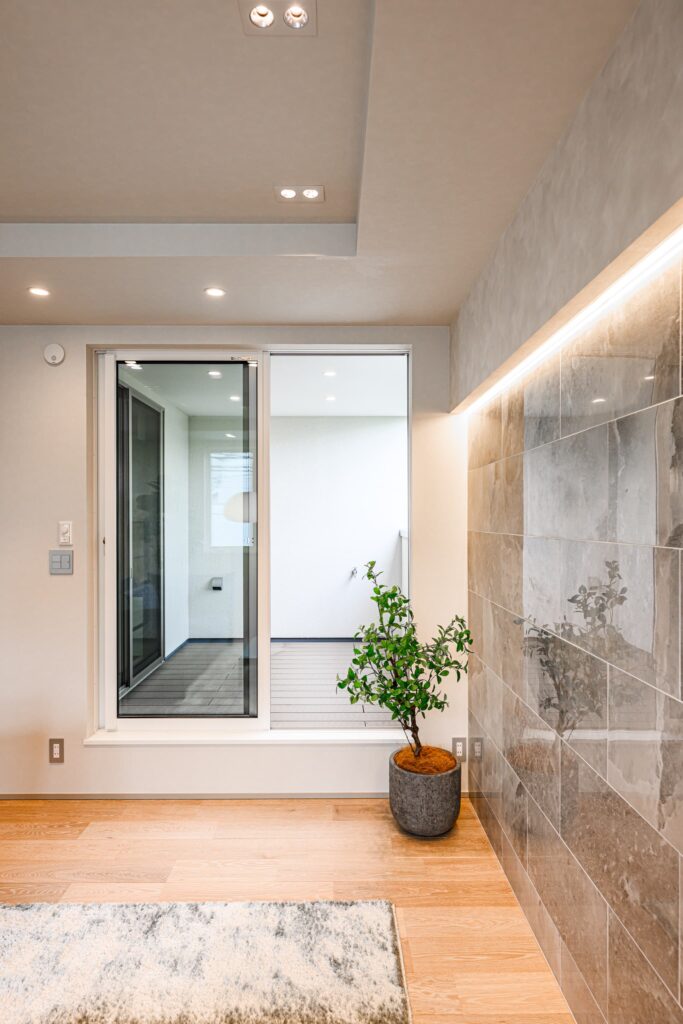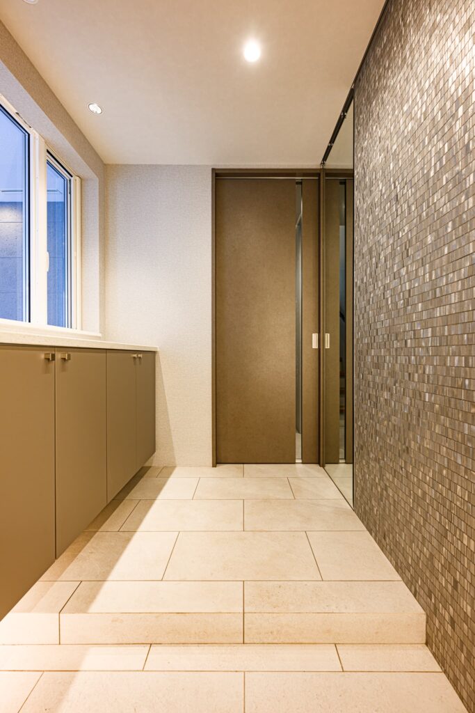 白い門柱と乱形石が続くアプローチが清潔感を漂わせ、重厚でありながら軽やかな印象を与えます。エントランスを進むと、シルバータイルが印象的なアクセントウォールが出迎え、間接照明がその凹凸を穏やかに照らします。やわらかな光と素材の表情が調和する空間の先には、隣地の緑を借景にした抜けのあるリビングが広がり、続きのインナーバルコニーが外との境界をやわらげます。プレーンベージュのフローリングとグレー調のタイルが上品に調和し、間接光が質感を際立たせ、エレガントで静謐な時間を描きます。ランドリールームには造作棚を設け、暮らしの中にも美しさと機能性をさりげなく添えています。