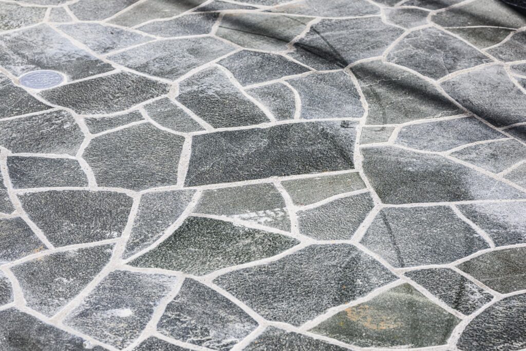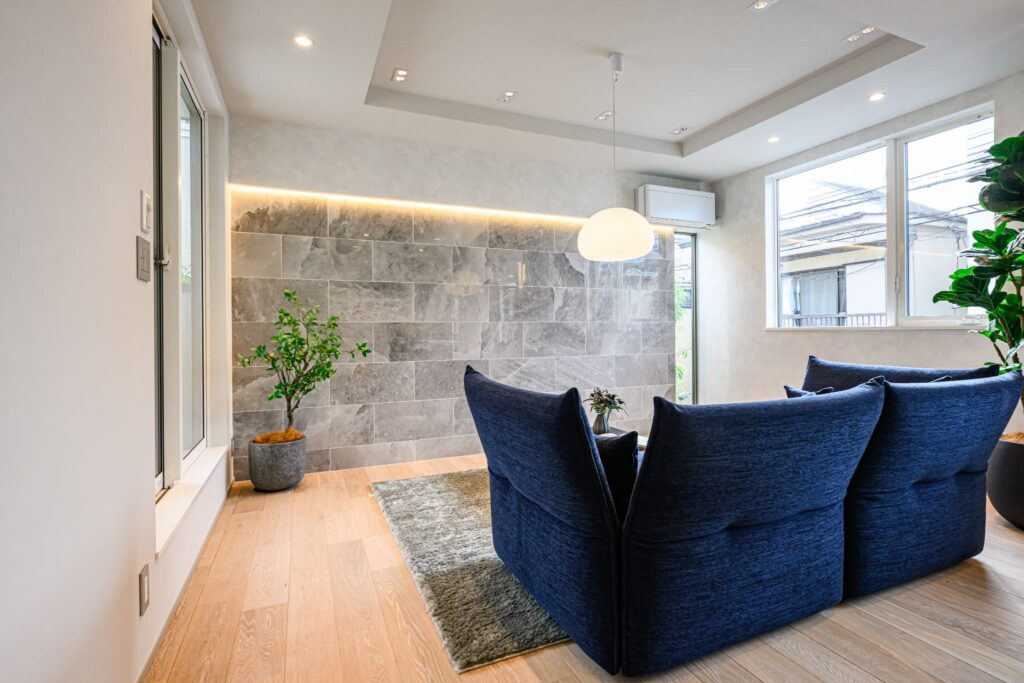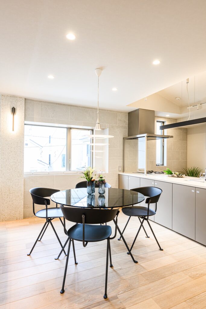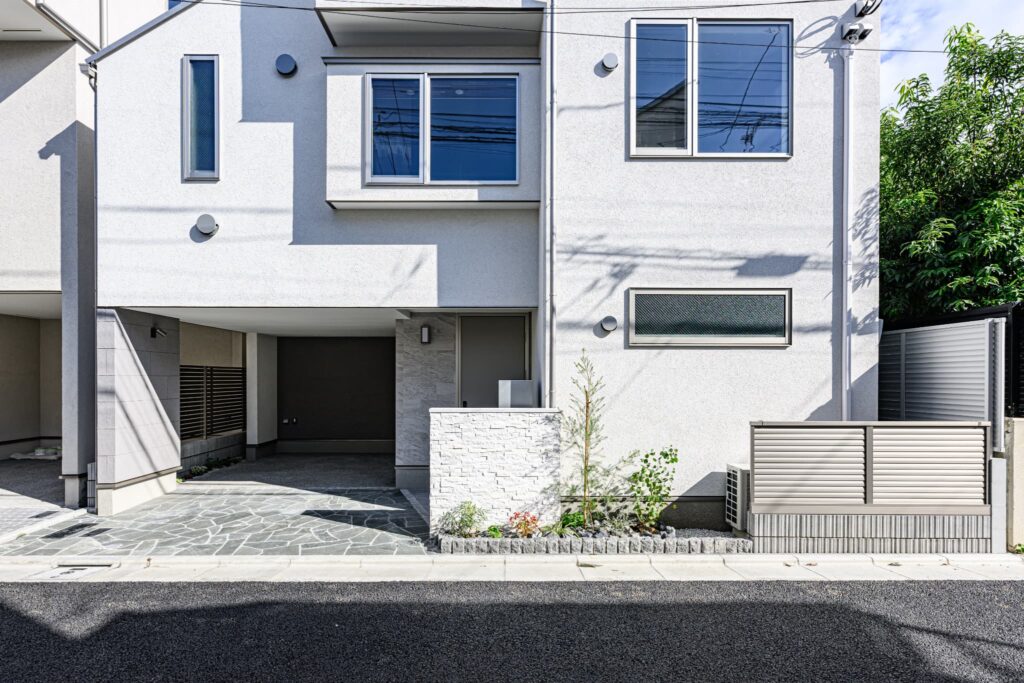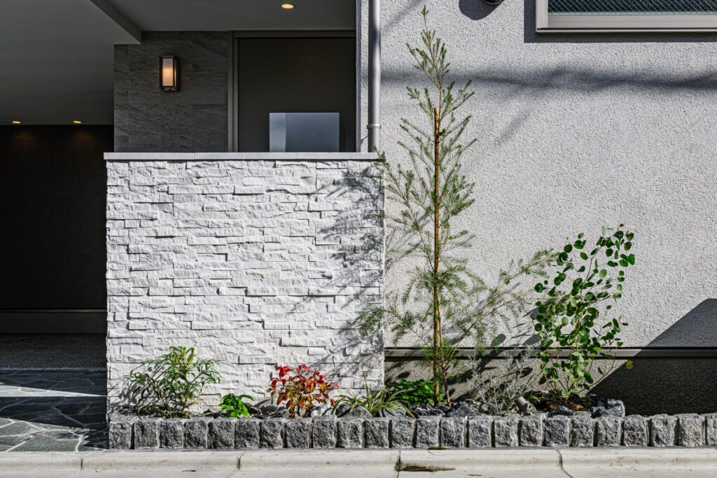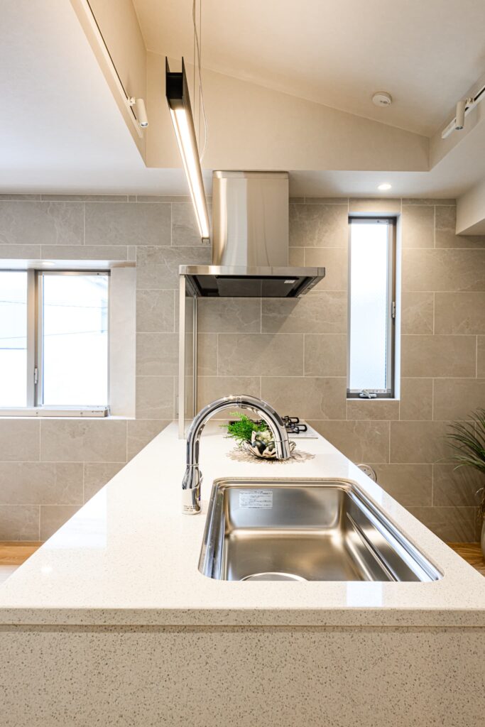 白い門柱と乱形石が続くアプローチが清潔感を漂わせ、重厚でありながら軽やかな印象を与えます。エントランスを進むと、シルバータイルが印象的なアクセントウォールが出迎え、間接照明がその凹凸を穏やかに照らします。やわらかな光と素材の表情が調和する空間の先には、隣地の緑を借景にした抜けのあるリビングが広がり、続きのインナーバルコニーが外との境界をやわらげます。プレーンベージュのフローリングとグレー調のタイルが上品に調和し、間接光が質感を際立たせ、エレガントで静謐な時間を描きます。ランドリールームには造作棚を設け、暮らしの中にも美しさと機能性をさりげなく添えています。