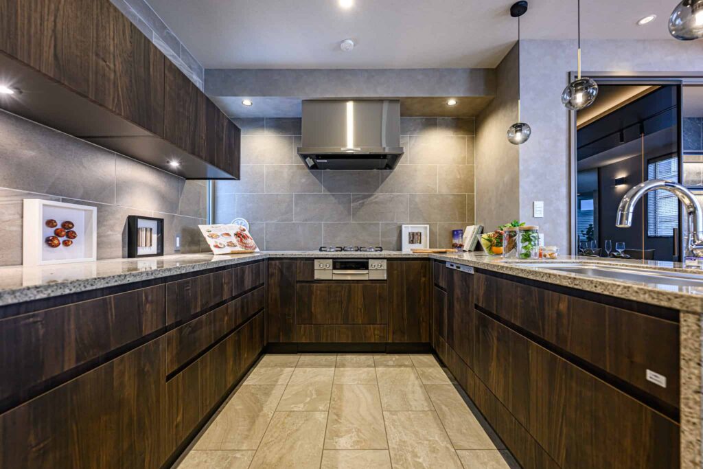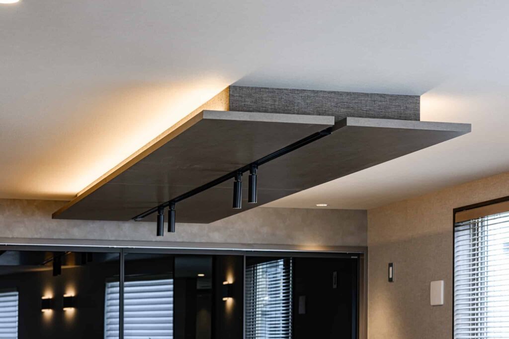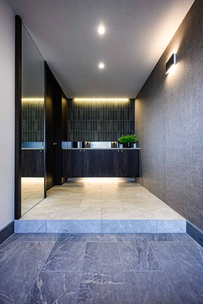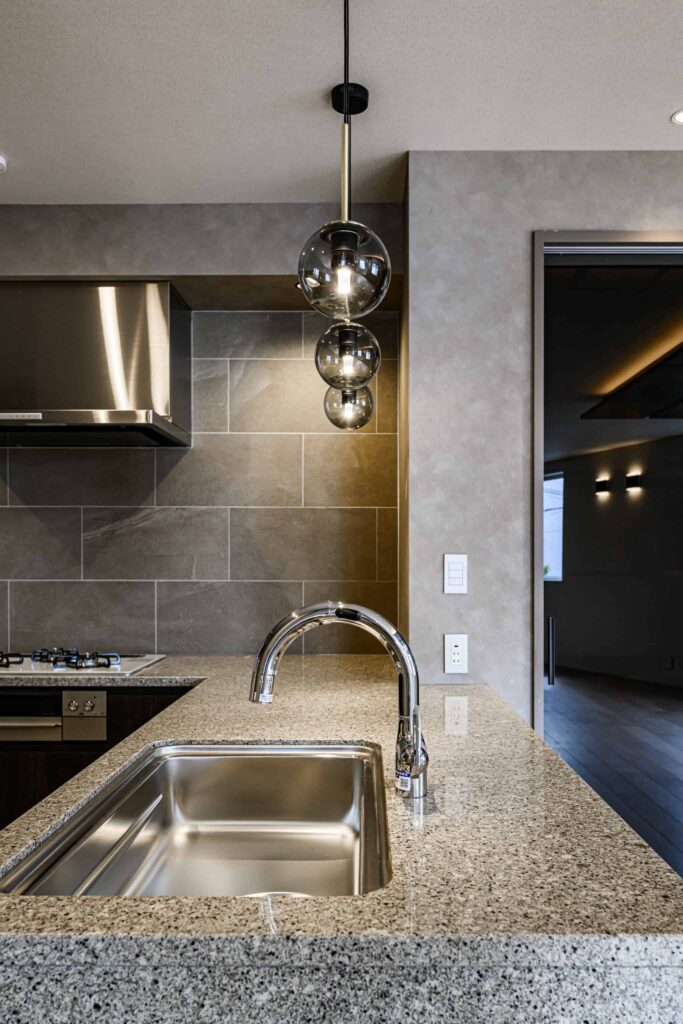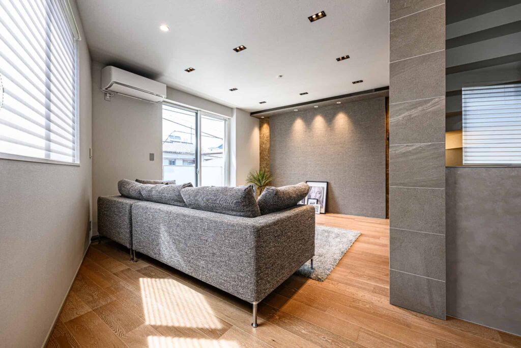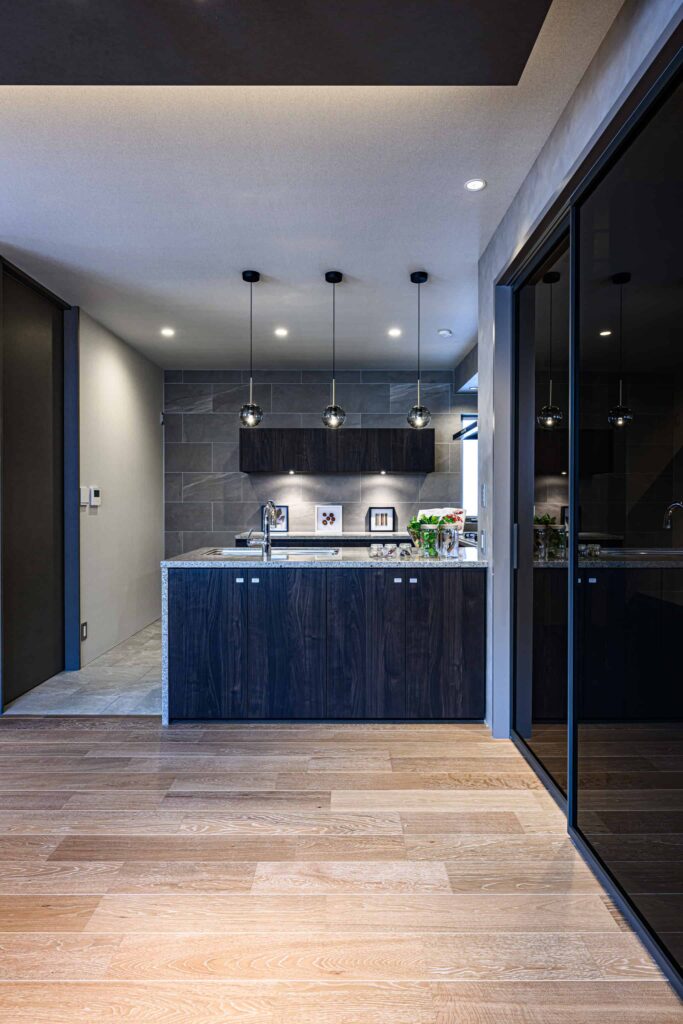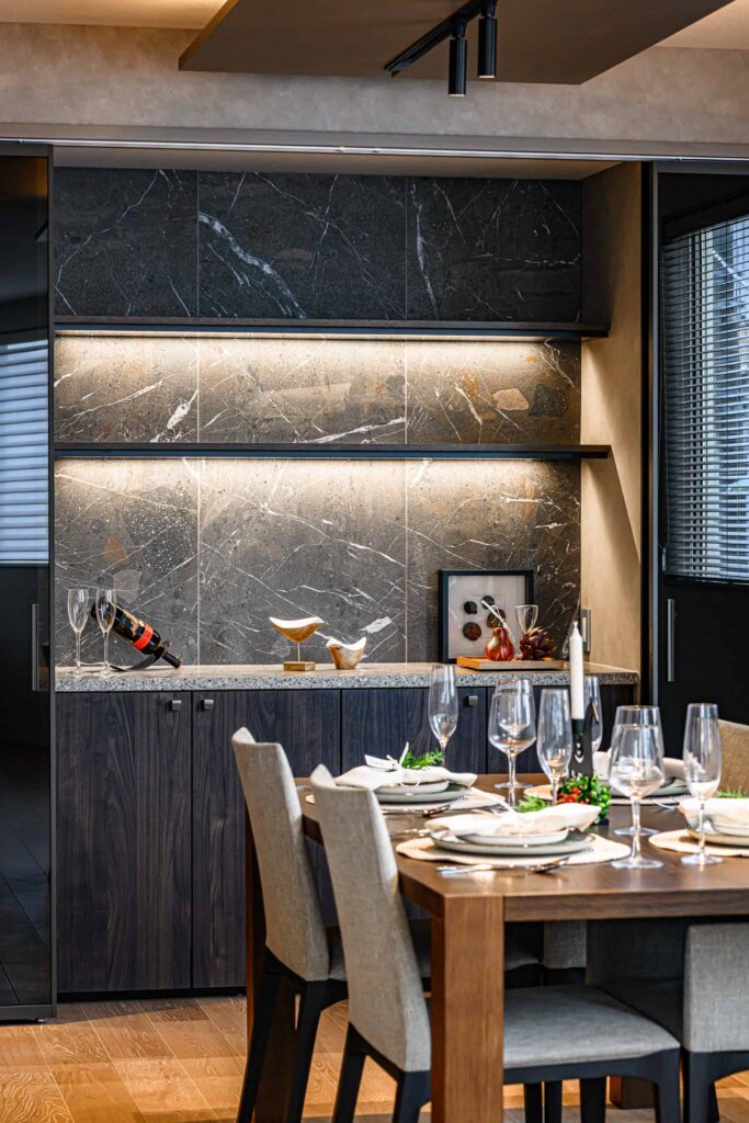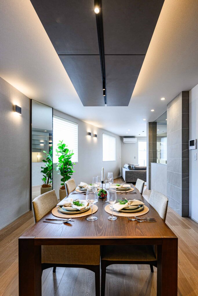 2階へと足を運ぶと、キッチン・リビング・ダイニングそれぞれがゆとりを持ち、心地よい「間」を感じられる空間が広がります。窓から差し込む柔らかな光に包まれた、グレー×ブラウンをベースとした内装は、外での喧騒を忘れ日常の穏やかな時間を思い出させてくれるでしょう。ダイニング横にはダイナミックな収納と間接照明を施した下がり天井を造作。ガラス扉の内側にまで照明を取り入れた収納は、視線を惹きつけるラグジュアリーな存在感を放ち、空間に上質さと華やかさを添えます。全体を通して、演出照明が織りなす光の陰影が美しい物件となりました。