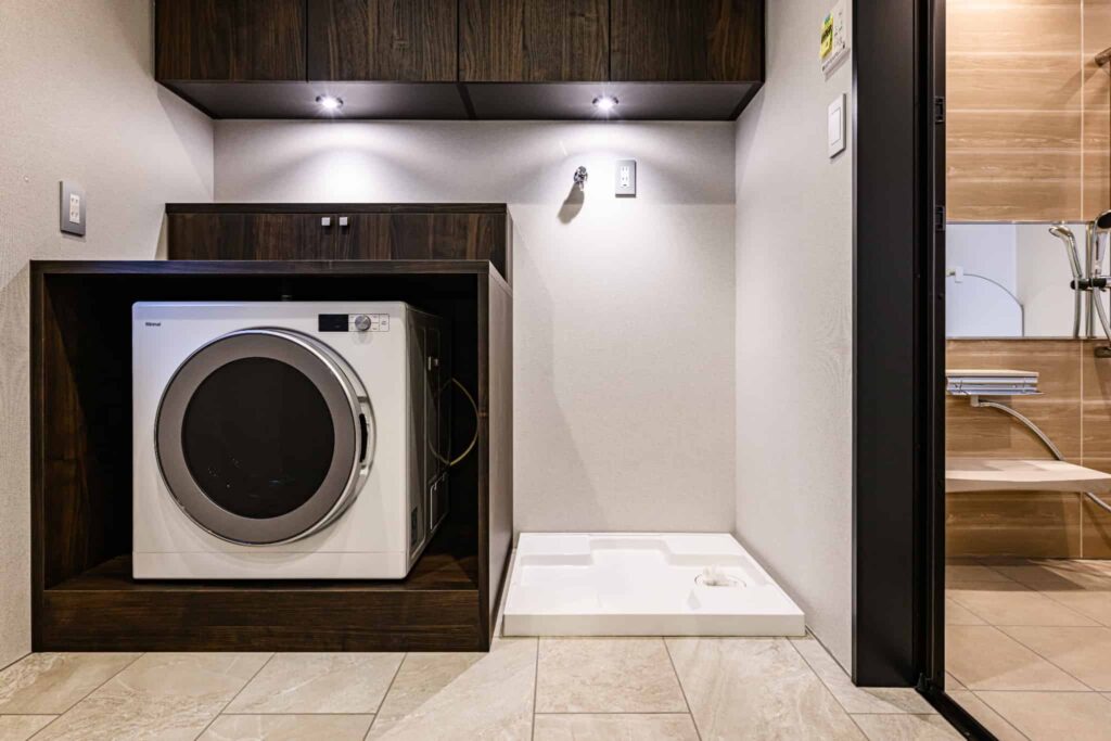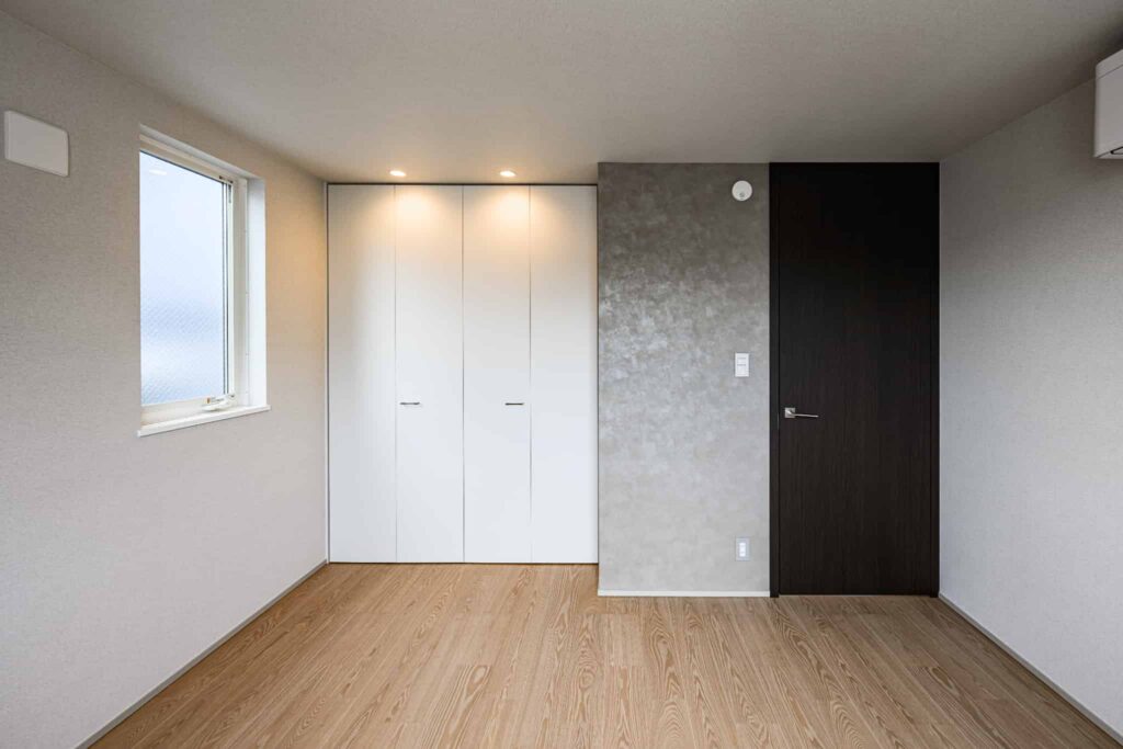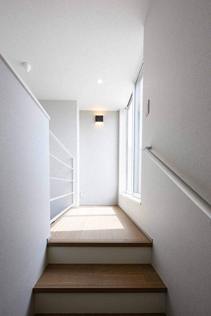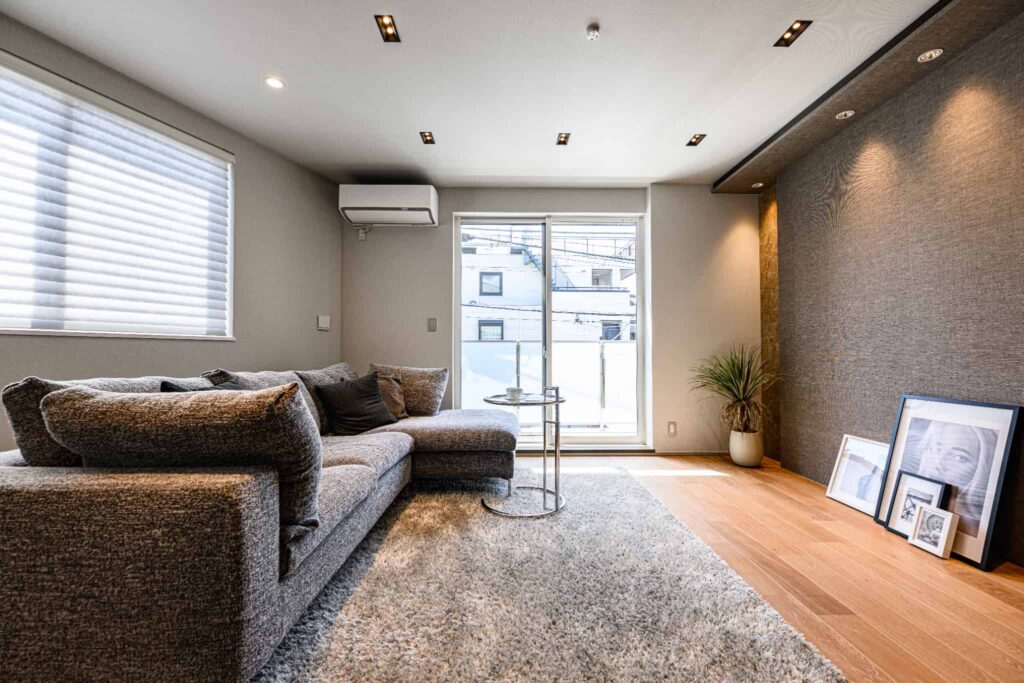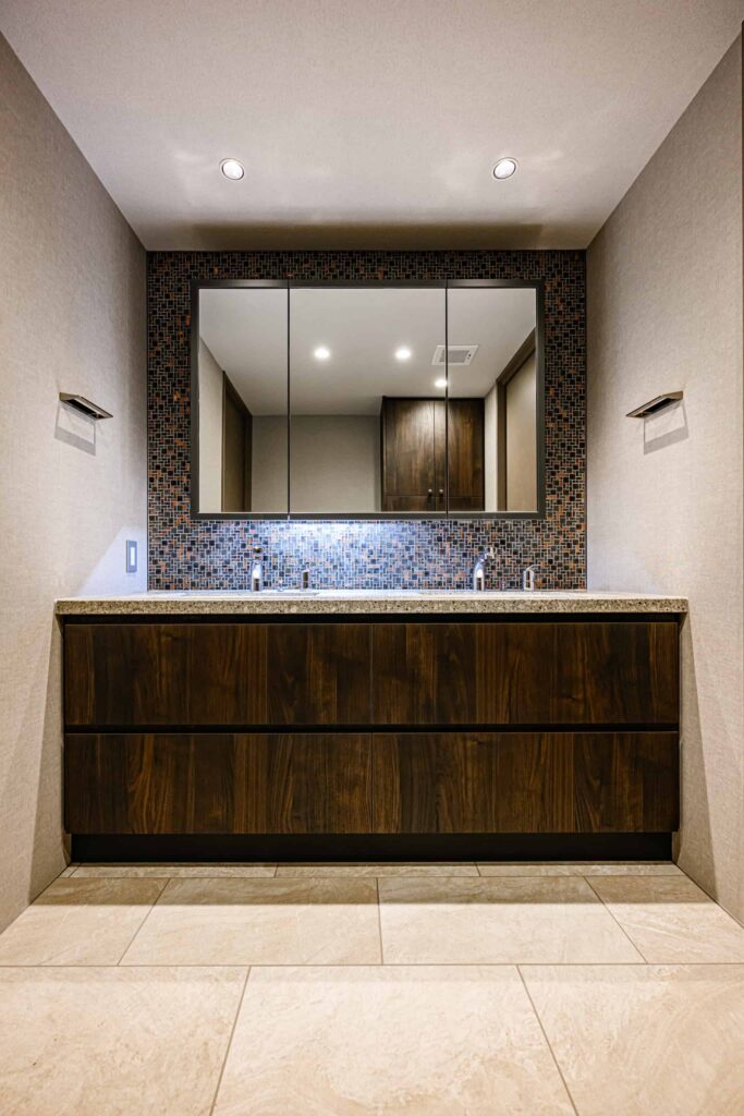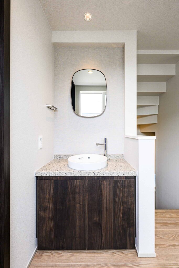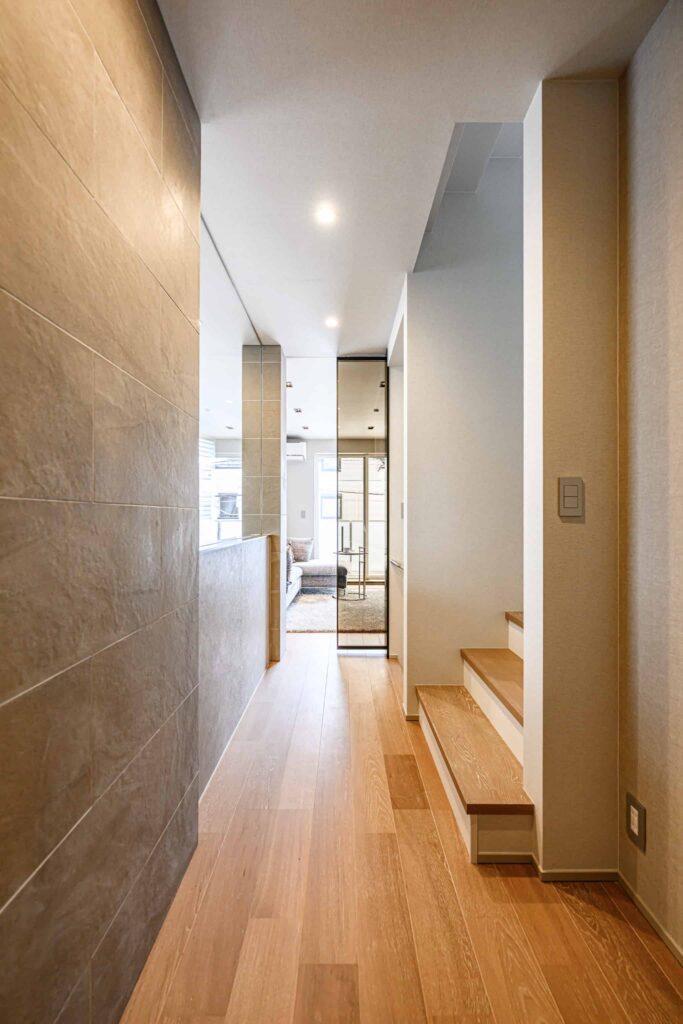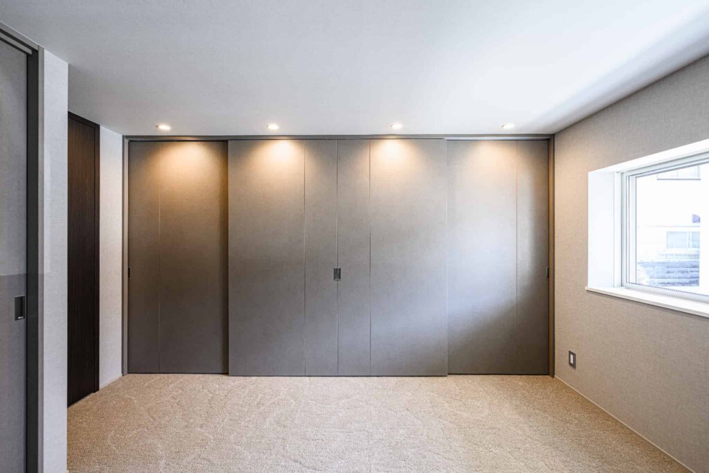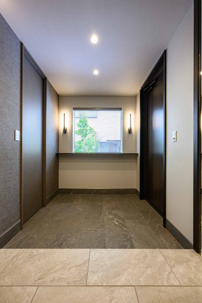 2階へと足を運ぶと、キッチン・リビング・ダイニングそれぞれがゆとりを持ち、心地よい「間」を感じられる空間が広がります。窓から差し込む柔らかな光に包まれた、グレー×ブラウンをベースとした内装は、外での喧騒を忘れ日常の穏やかな時間を思い出させてくれるでしょう。ダイニング横にはダイナミックな収納と間接照明を施した下がり天井を造作。ガラス扉の内側にまで照明を取り入れた収納は、視線を惹きつけるラグジュアリーな存在感を放ち、空間に上質さと華やかさを添えます。全体を通して、演出照明が織りなす光の陰影が美しい物件となりました。