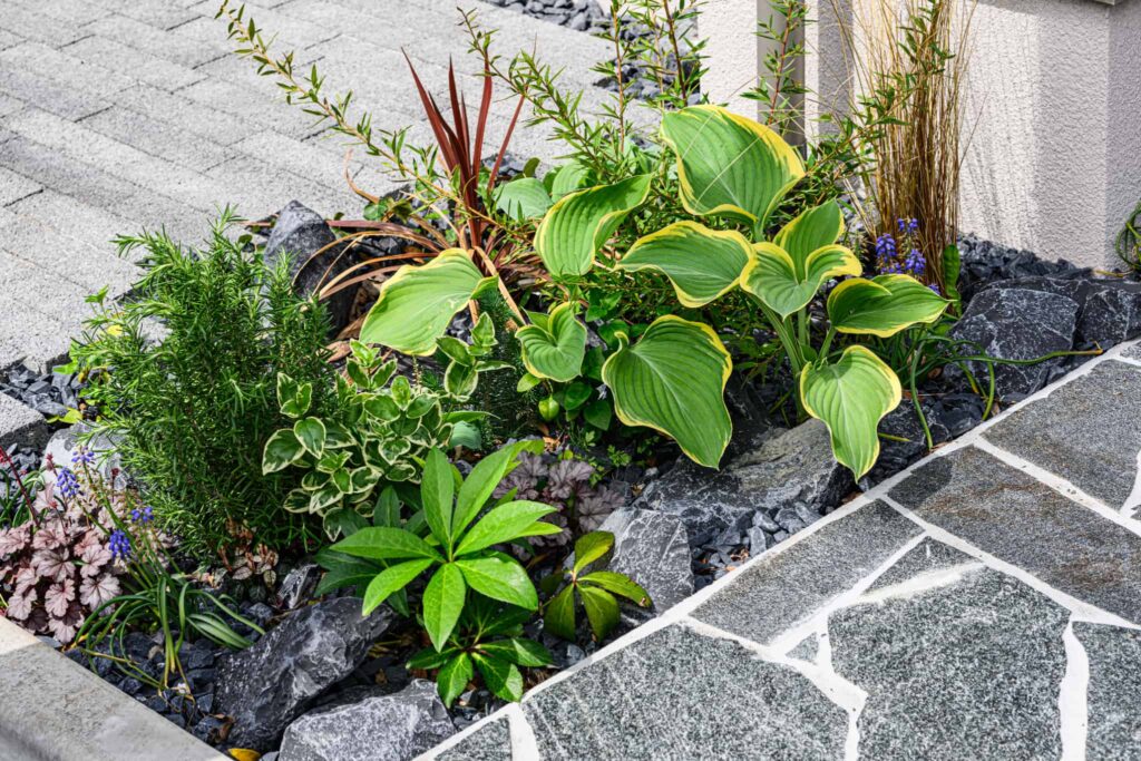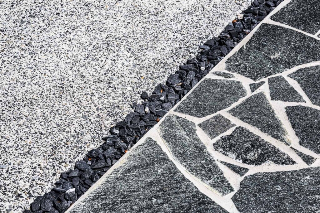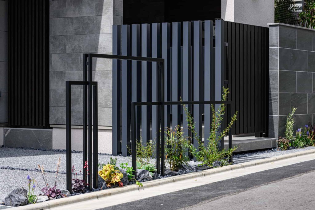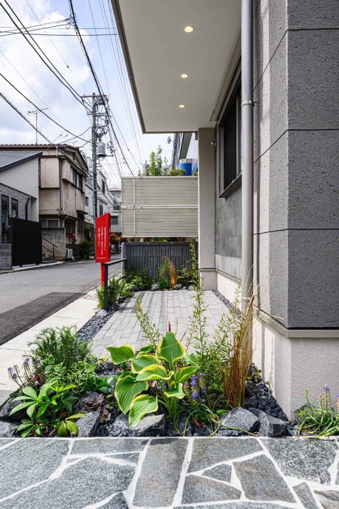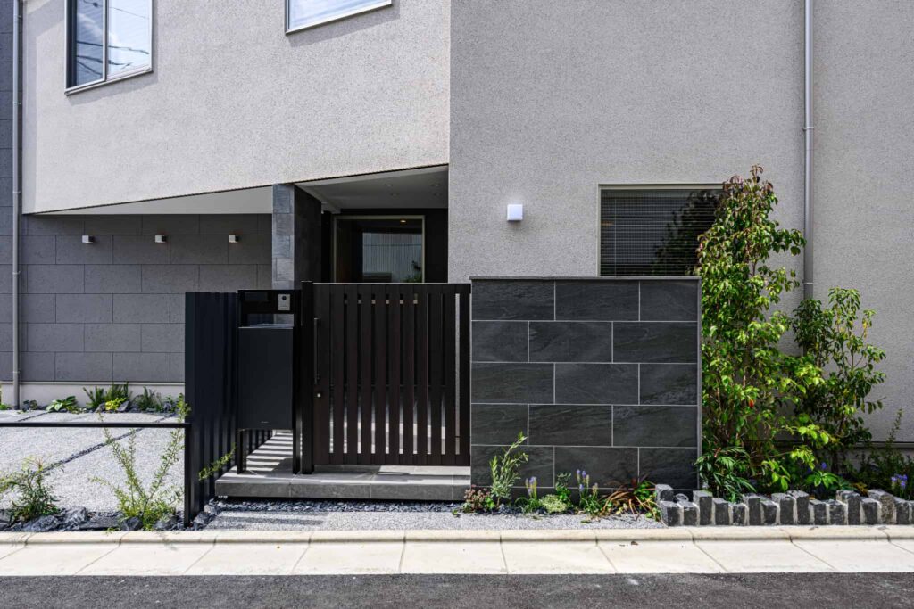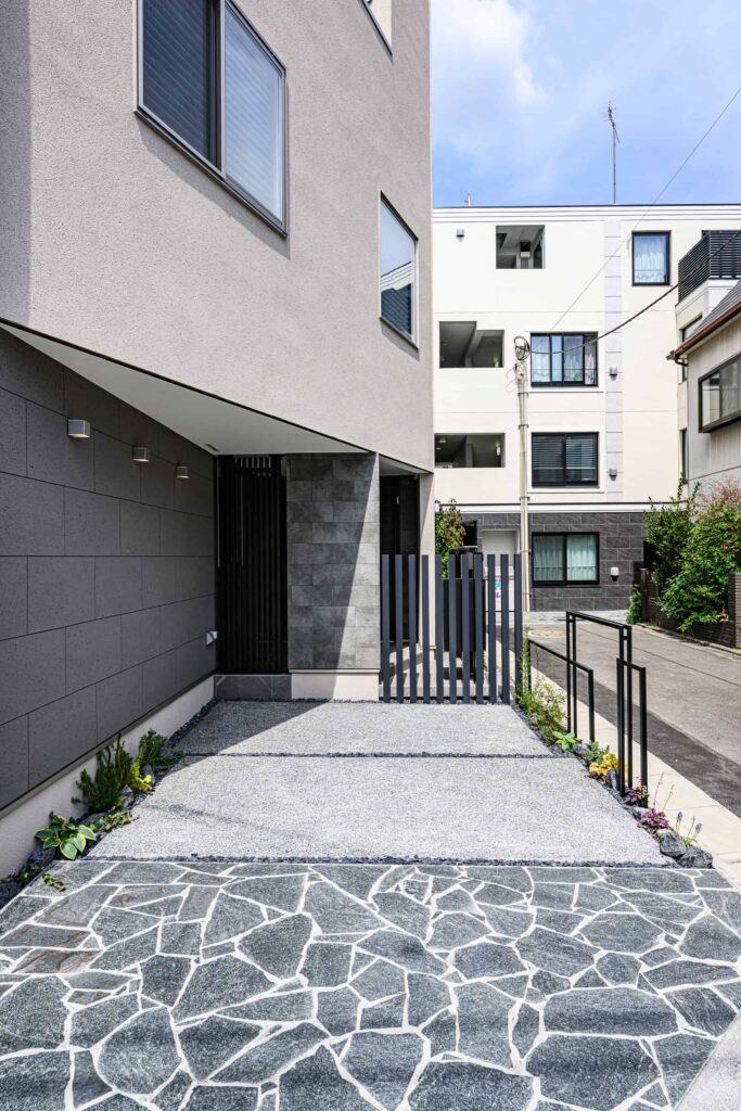 乱形石や割栗石といった自然素材を贅沢にあしらった車庫は建物全体の重厚感をより一層引き立て、邸宅としての風格を静かに物語ります。