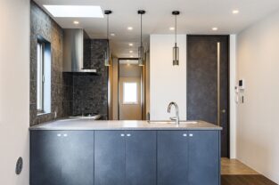 建物全体を通して暗さが目立たないようグレーを中心にさわやかさを感じる色味でコーディネートしていますが、石で立体感を出したり、ポイントでブラックやウォールナット系の濃い色味を入れることで引き締めを図る工夫をしました。床材にはウォールナットよりもさわやかでオークよりも暖かみを感じるブラックチェリー色を採用しています。