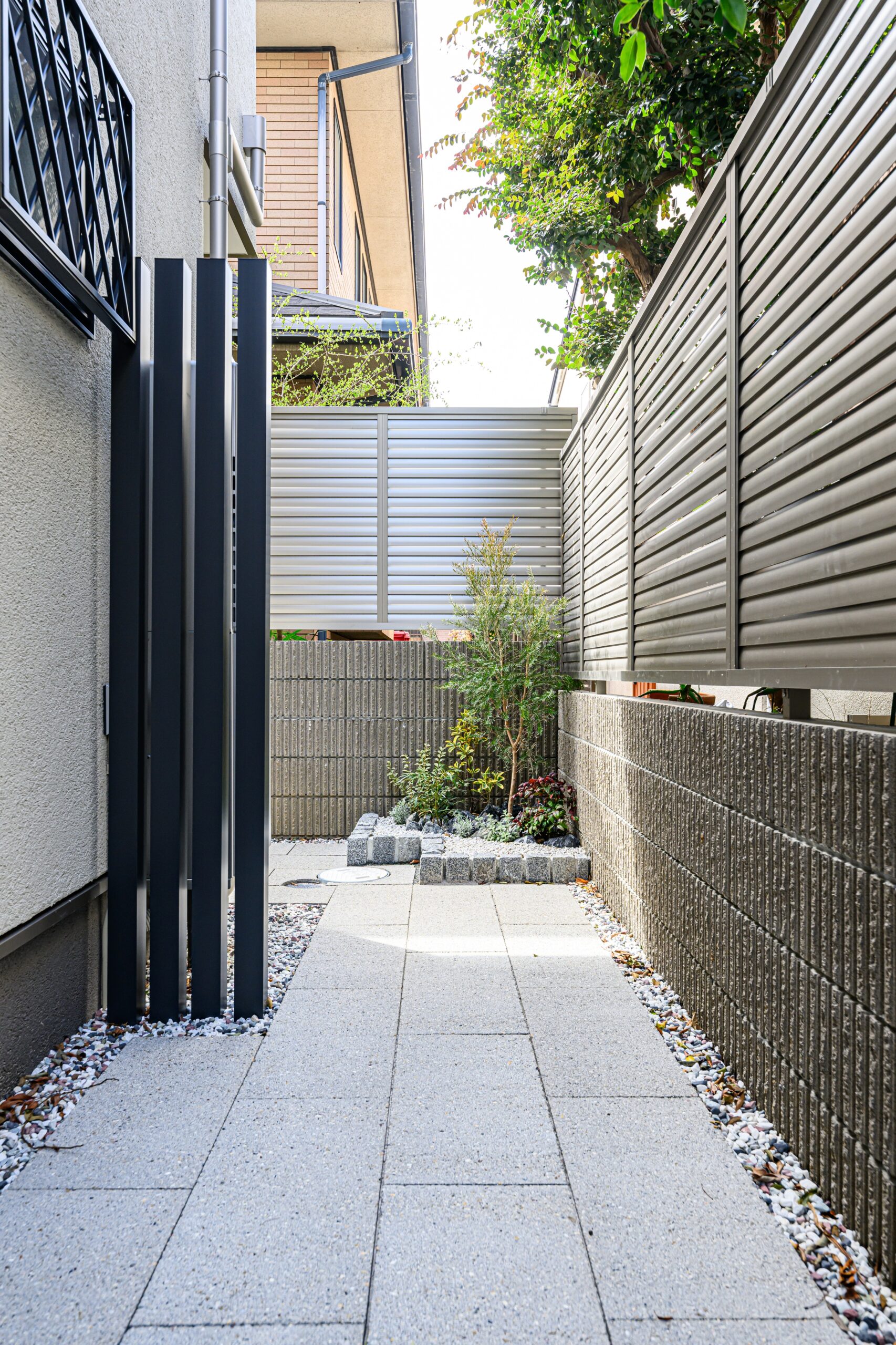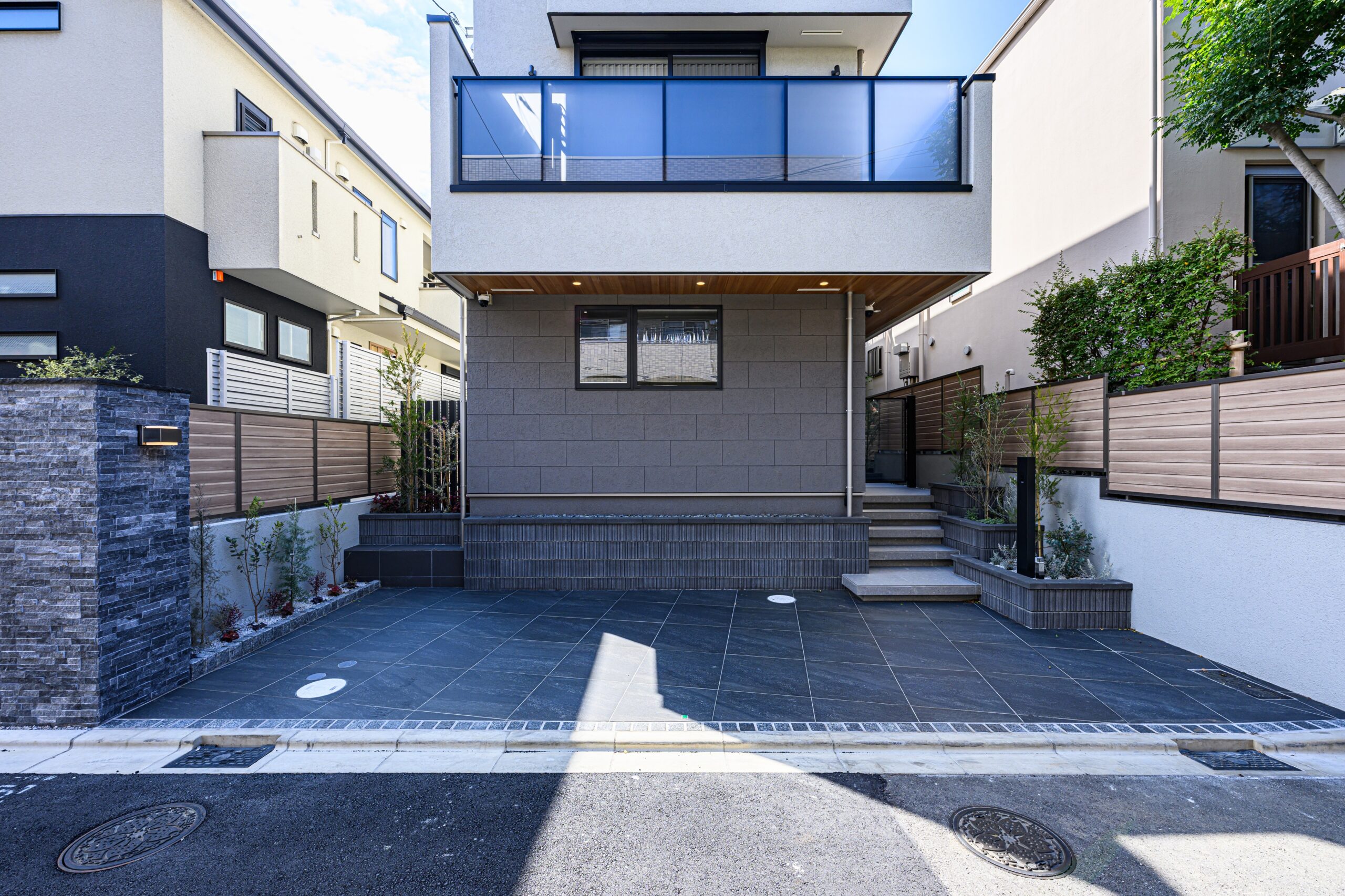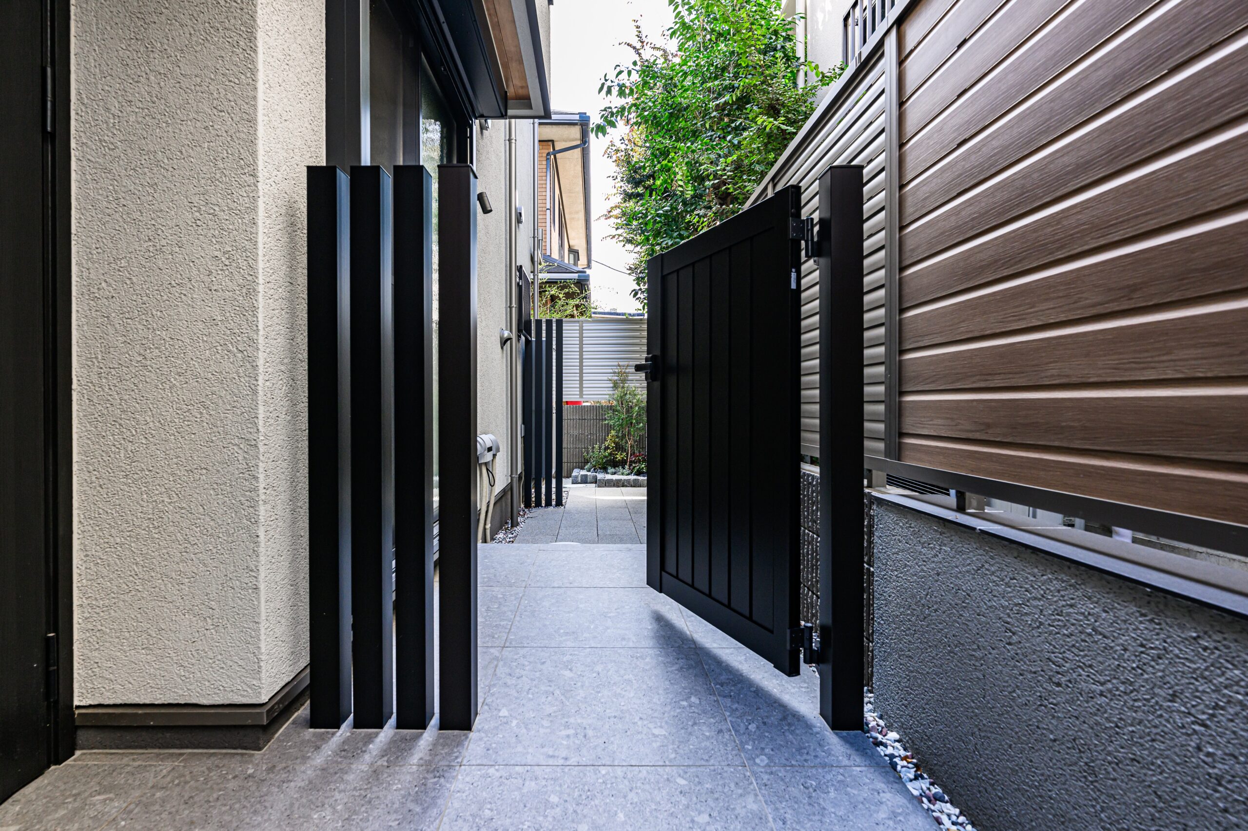 玄関ポーチの先にはさらに門扉を設け、外部の余白を活かしたプライベート性の高いガーデンエリアを計画しました。コの字型に裏手まで囲われているので安全性も高く、お子さんや愛犬が走り回っても安心して過ごせると思います。
