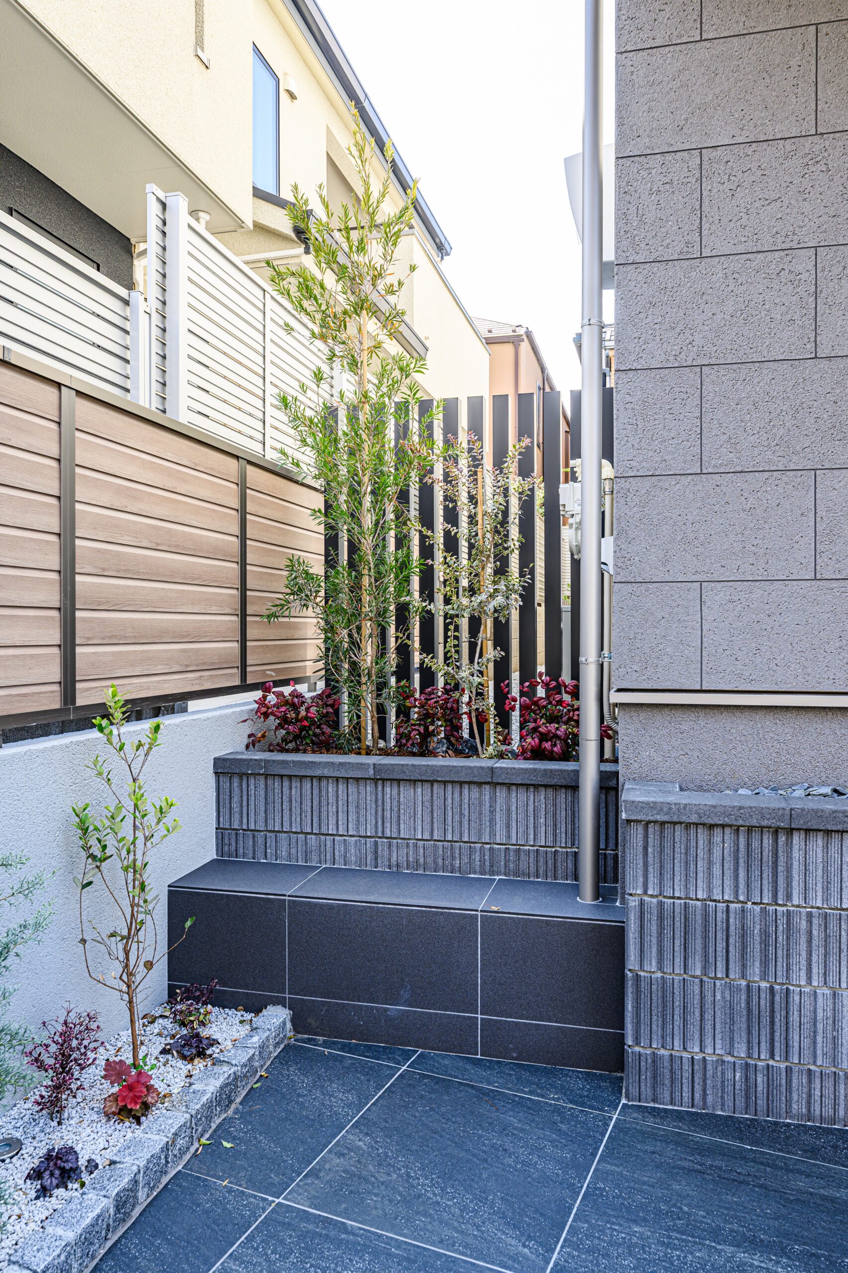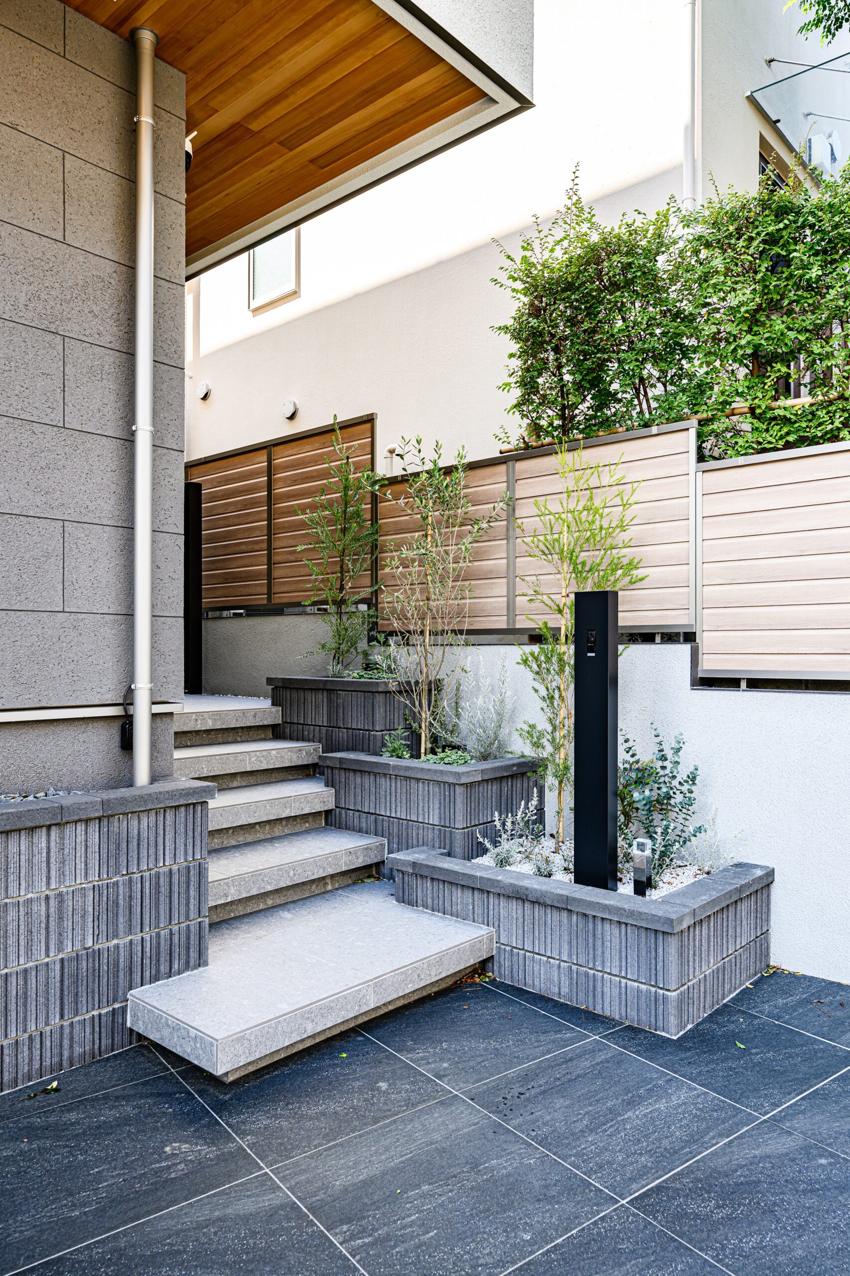 玄関は奥まった位置に配置したので、そこまでのアプローチは目を楽しませられるように花壇を段状に置いてリズムを持たせています。
