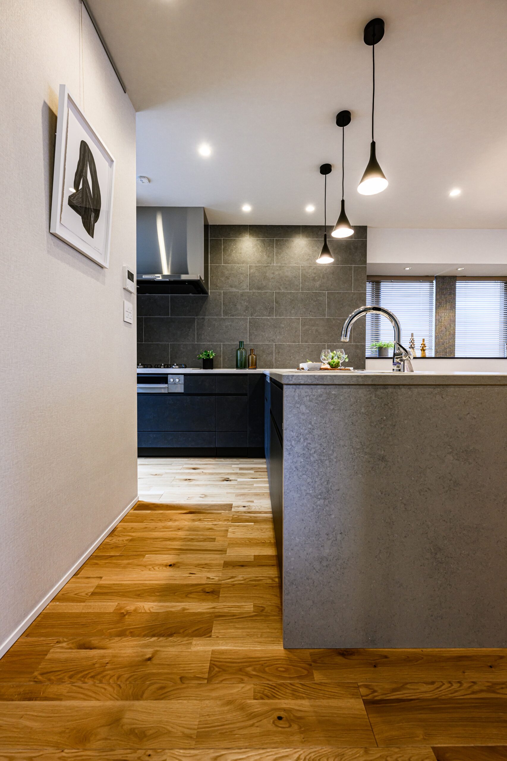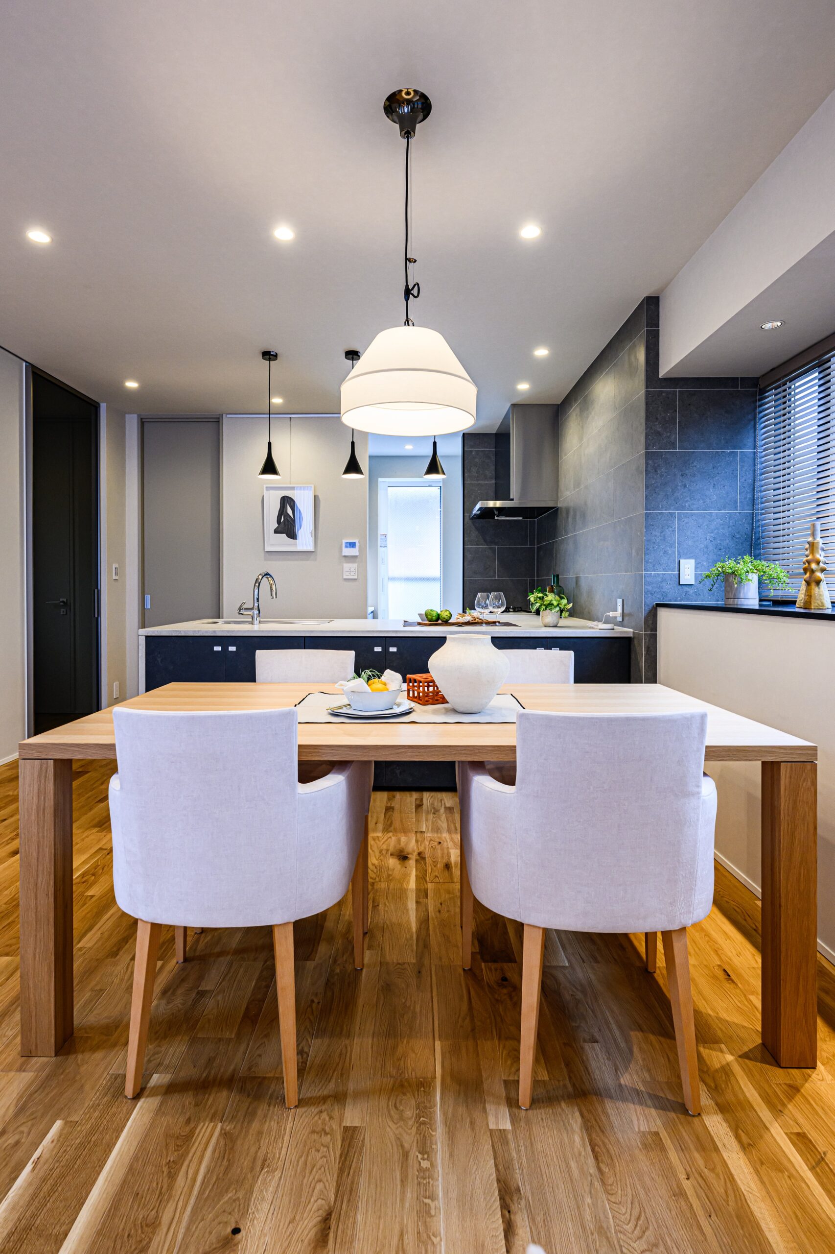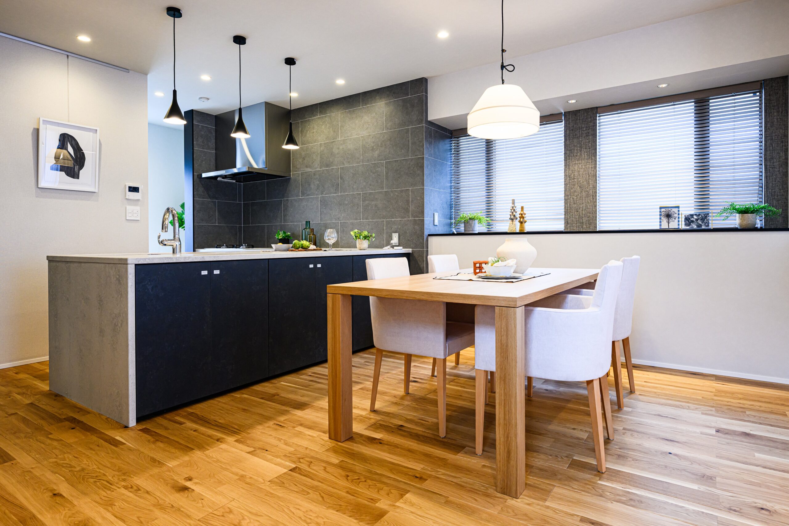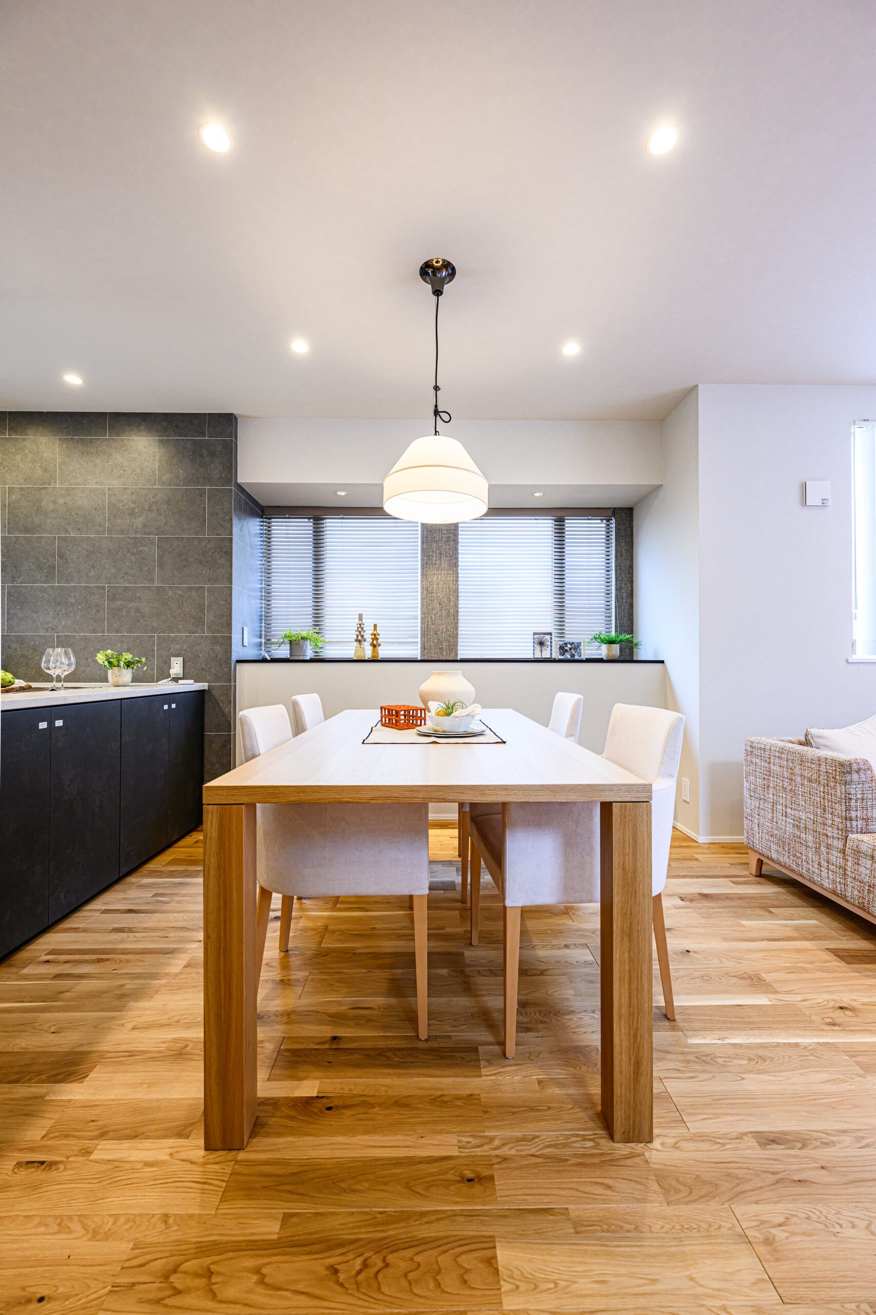 LDKはオーソドックスな間取りではありますが、各所に充分な間を確保し、境界を感じさせない一体感のある空間にまとまりました。内装は明るめの色味をベースとしつつ差し色として部分的に黒を取り入れることでメリハリを持たせています。