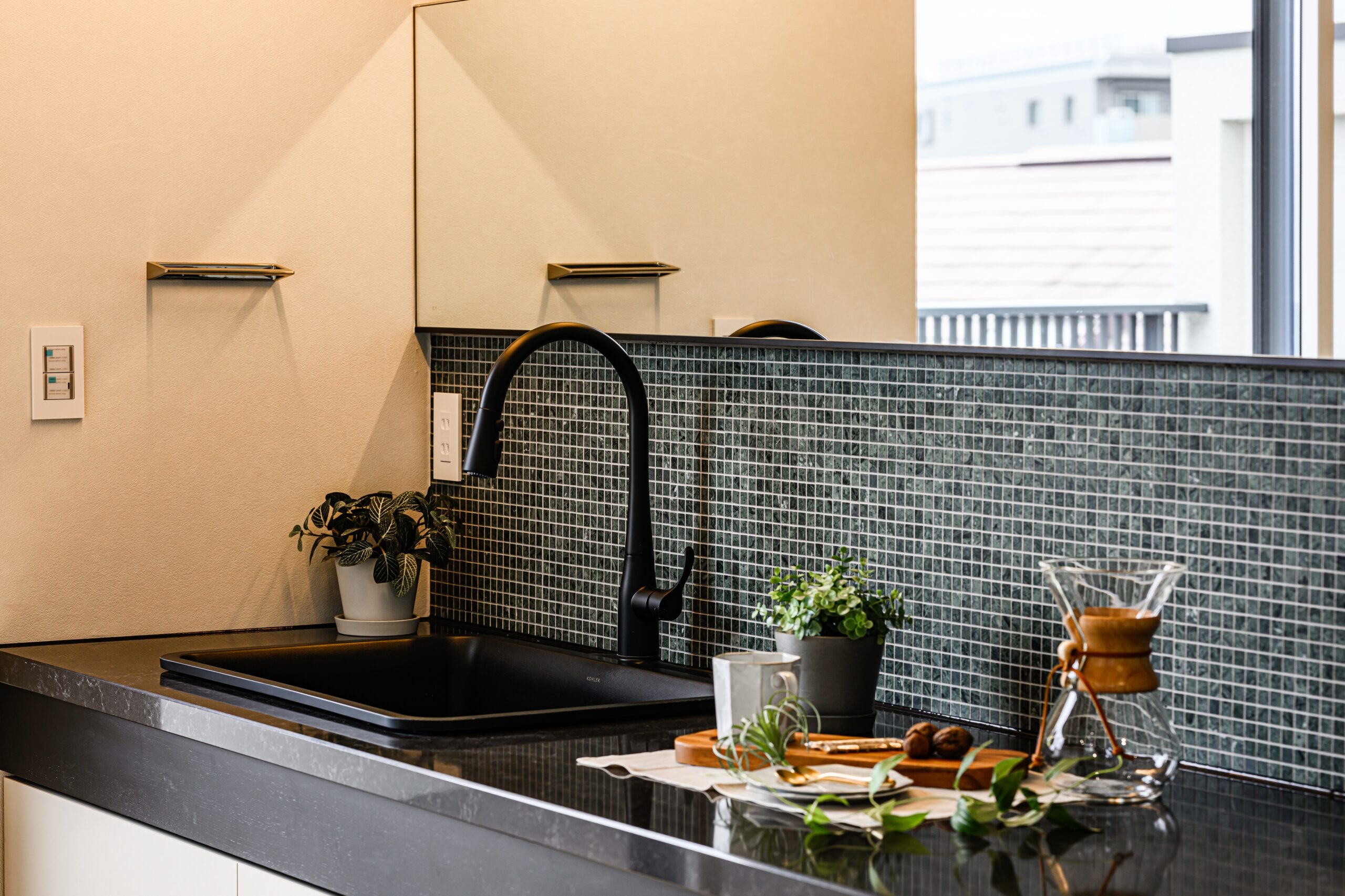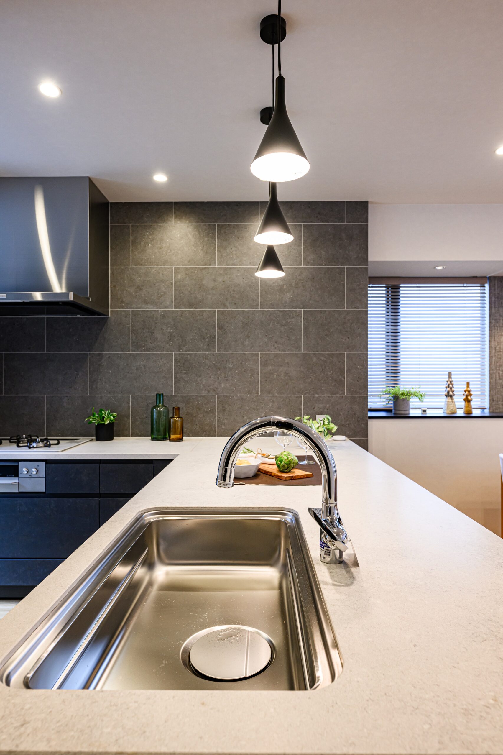 そして、なんといってもこのフロアからは花火大会を至近距離で眺めることができます。1年に1回、日常の景色が非日常になる、そんな特別な瞬間を感じていただきたいです。多目的ホールにはミニキッチンと冷蔵庫も完備したので、お酒を冷やしたり簡単なおつまみを作ることも可能です。普段はセカンドリビングとして贅沢に使ってもらいたいですね。ミニキッチンについては、海外製のブラックのシンクや水栓で生活感を抑えたラグジュアリーな佇まいになるよう細部までこだわりました。
