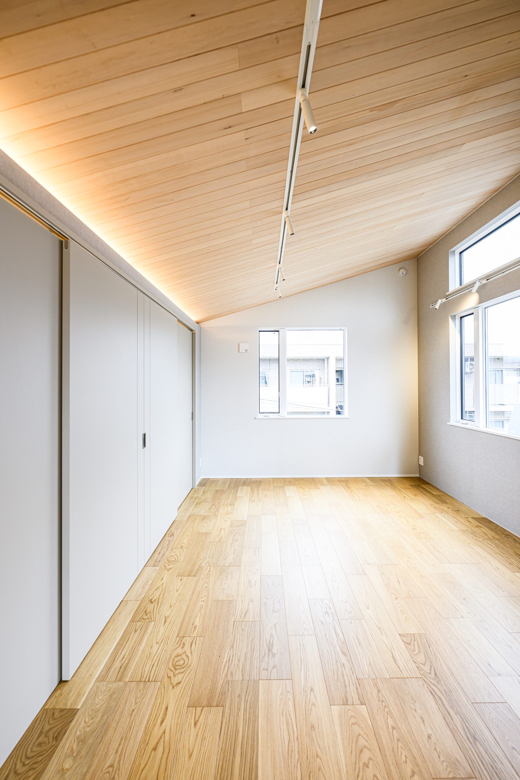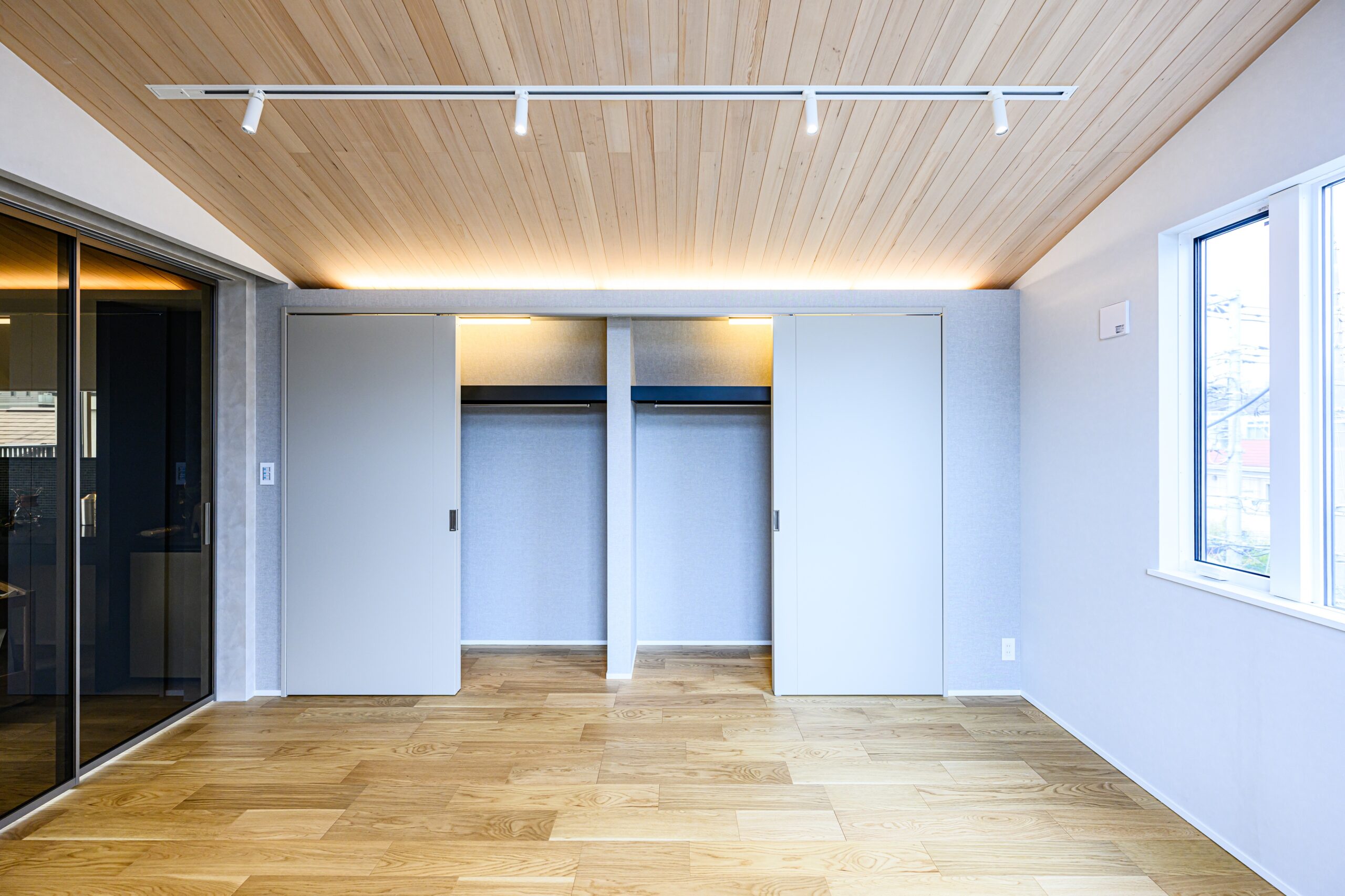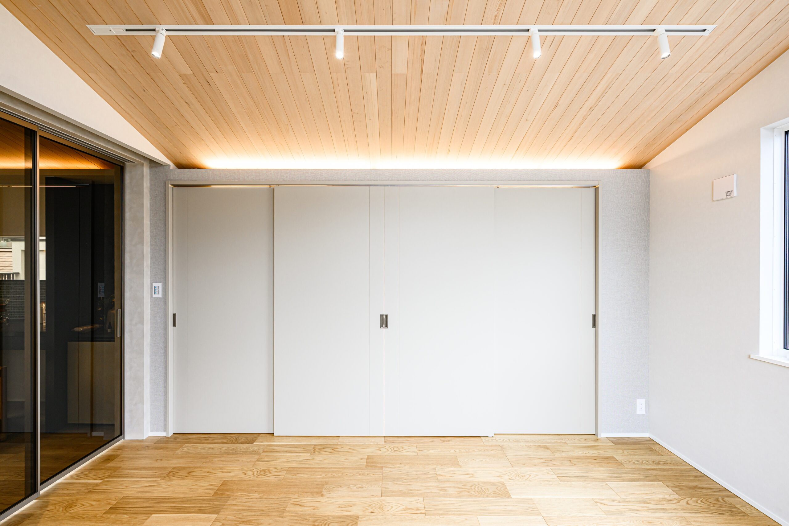 多目的ホール・主寝室は、南向きのバルコニーから室内全体に温かい光が差し込みます。ガラス戸を開放することで一体的に使うことができる計画としました。天井の勾配や羽目板仕上げを揃えることで、視線の広がりを活かしたダイナミックで印象的な空間構成になっています。
