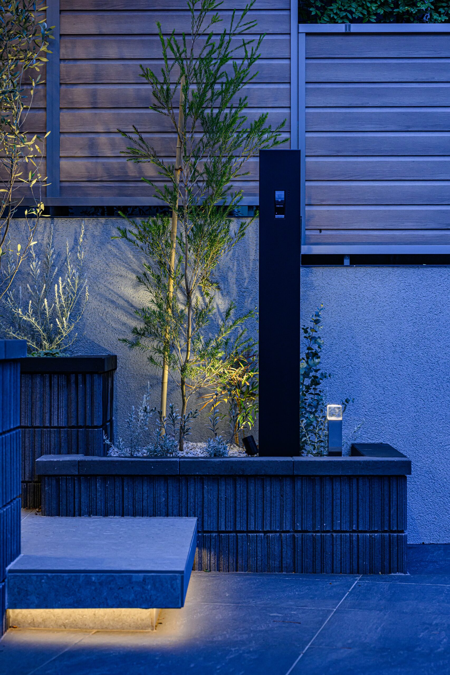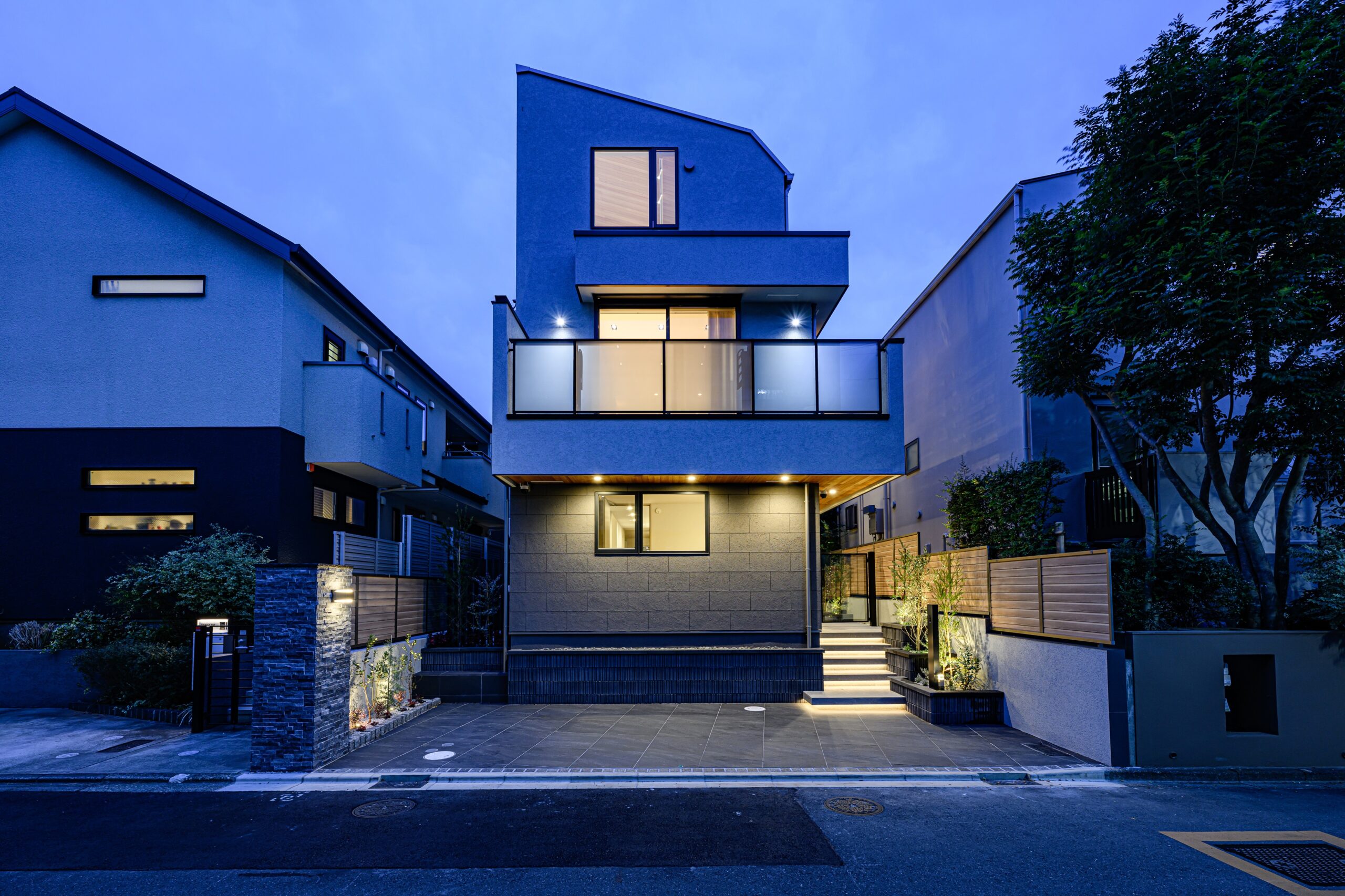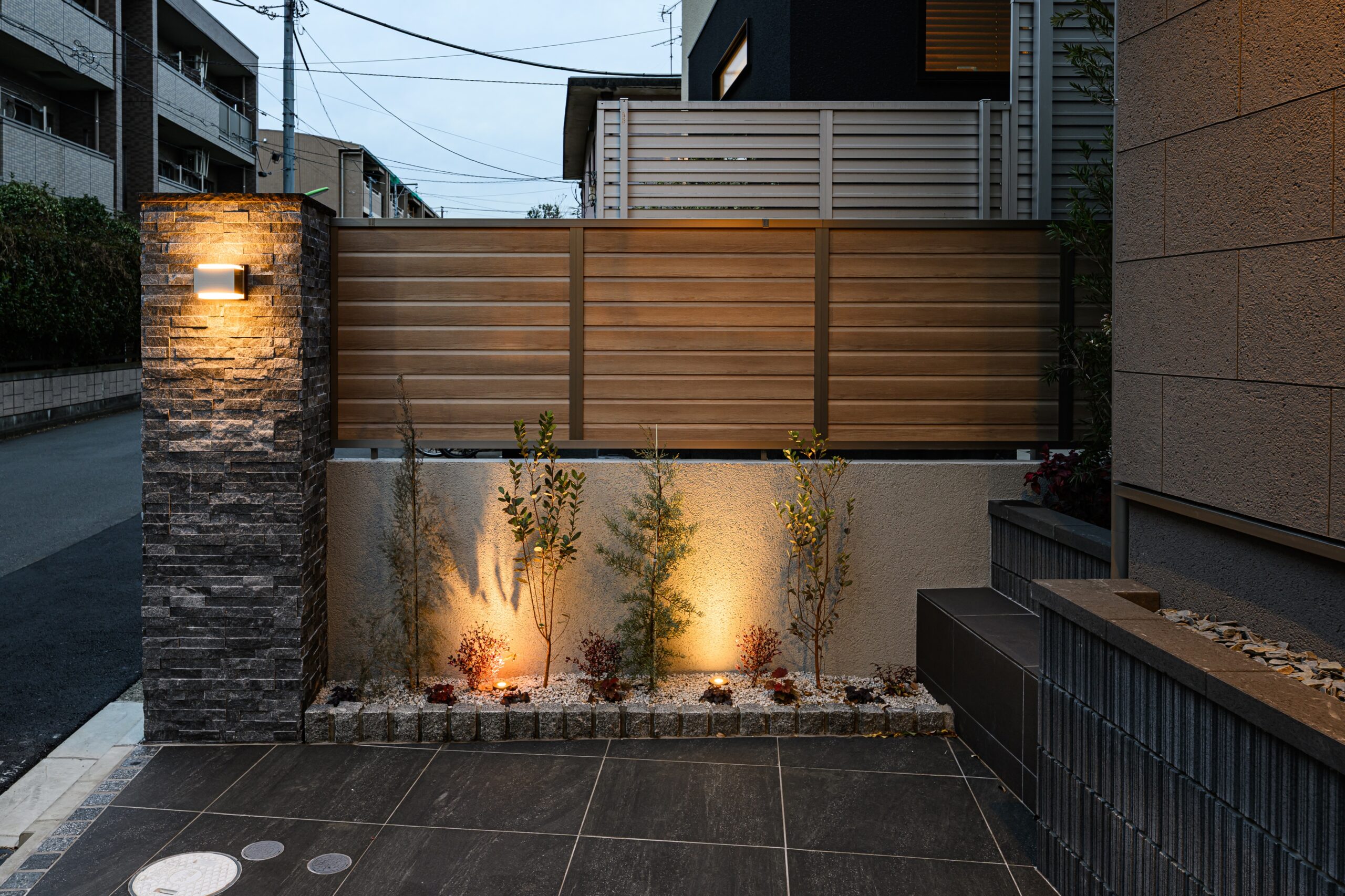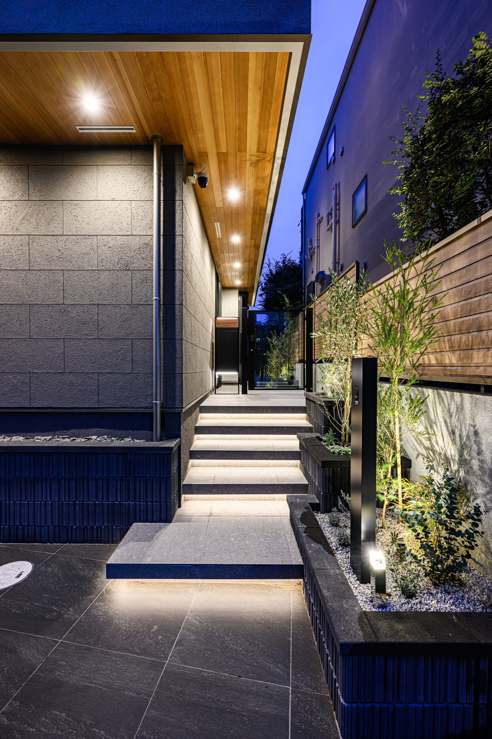 アプローチステップにはライン照明を仕込み、夜間の帰宅も安心