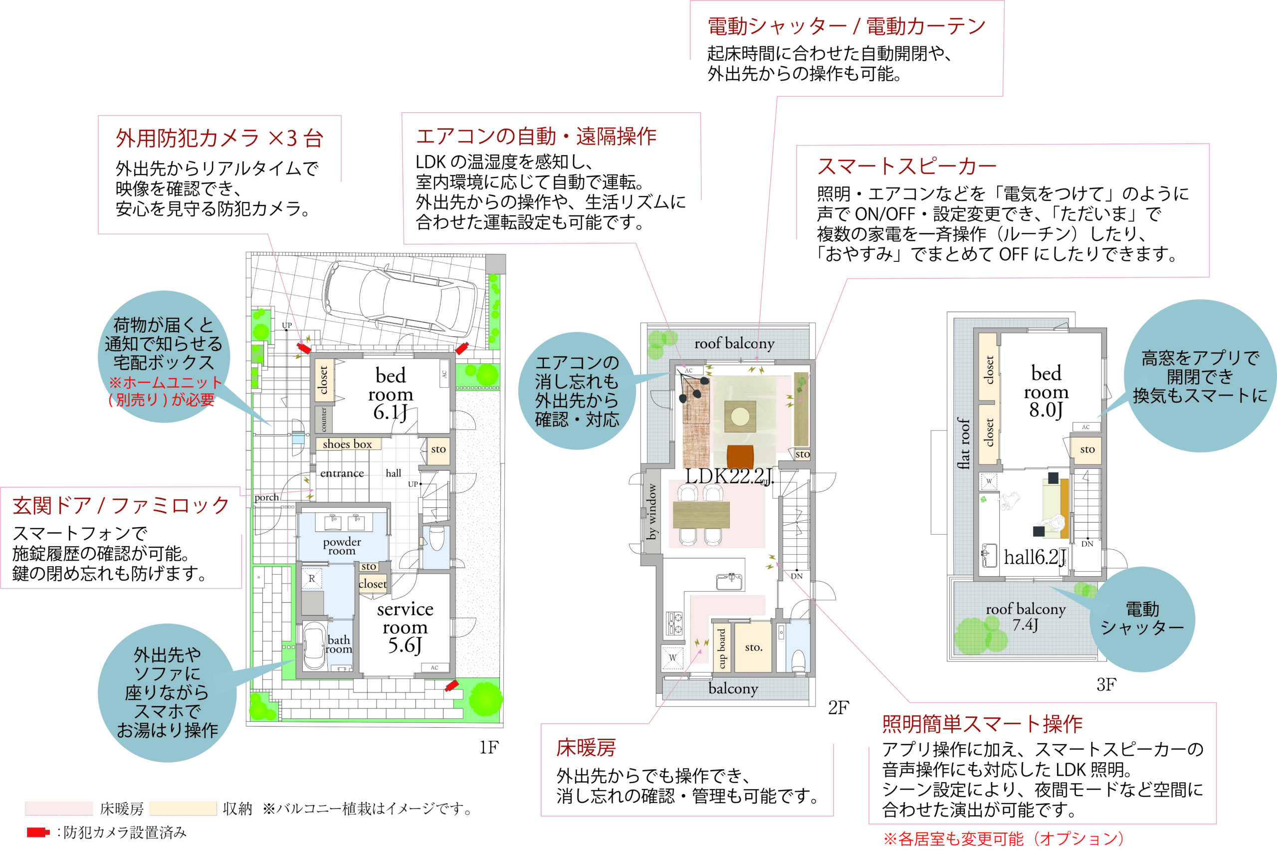 また、事前にIoT機器の導入も検討していました。仕組みや操作が難しそうなイメージから導入に踏み切れない方も多いかと思いますが、本物件ではセッティングを完了した状態でお引渡ししており、鍵の閉め忘れがなくなったり、シャッターの時間設定による開閉操作、空調・照明の一括管理、外出先からの遠隔操作などが可能です。住み始めたその日から「より豊かで便利な暮らし」を体感していただけます。